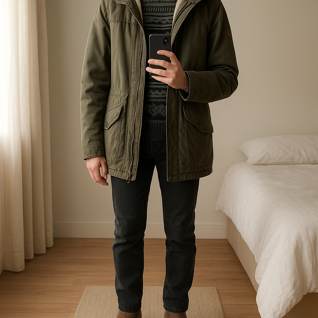Parka debout, face à la caméra, dans une chambre à la lumière douce, avec une lumière naturelle filtrant par la fenêtre.