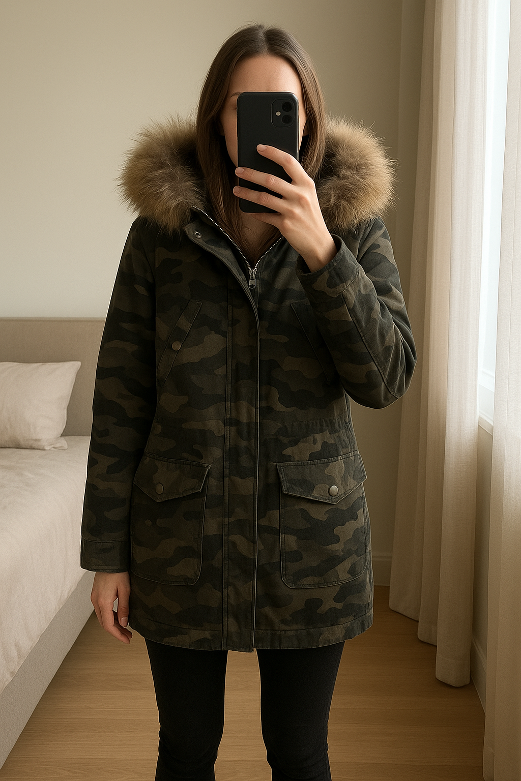 Parka camouflage debout, face à la caméra, dans une chambre à la lumière douce, avec une lumière naturelle filtrant par la fenêtre.
