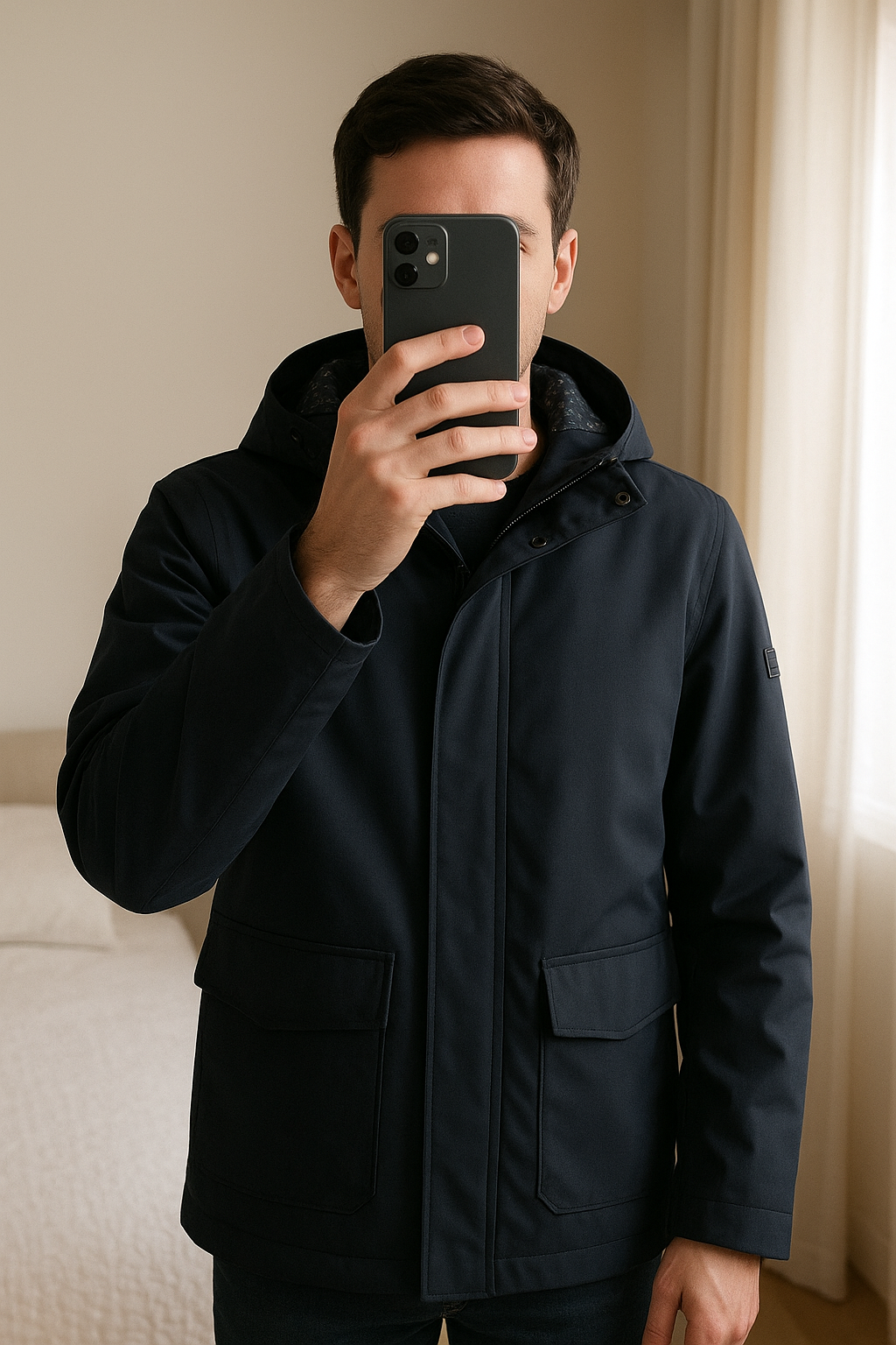 Parka Izaac debout, face à la caméra, dans une chambre à la lumière douce, avec une lumière naturelle filtrant par la fenêtre.