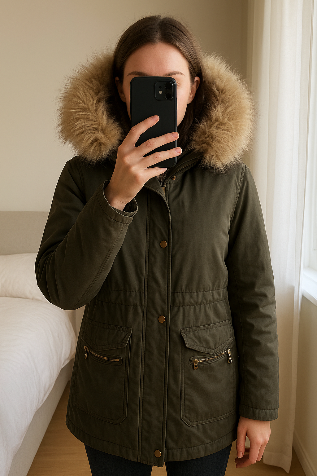 Parka taille S debout, face à la caméra, dans une chambre à la lumière douce, avec une lumière naturelle filtrant par la fenêtre.