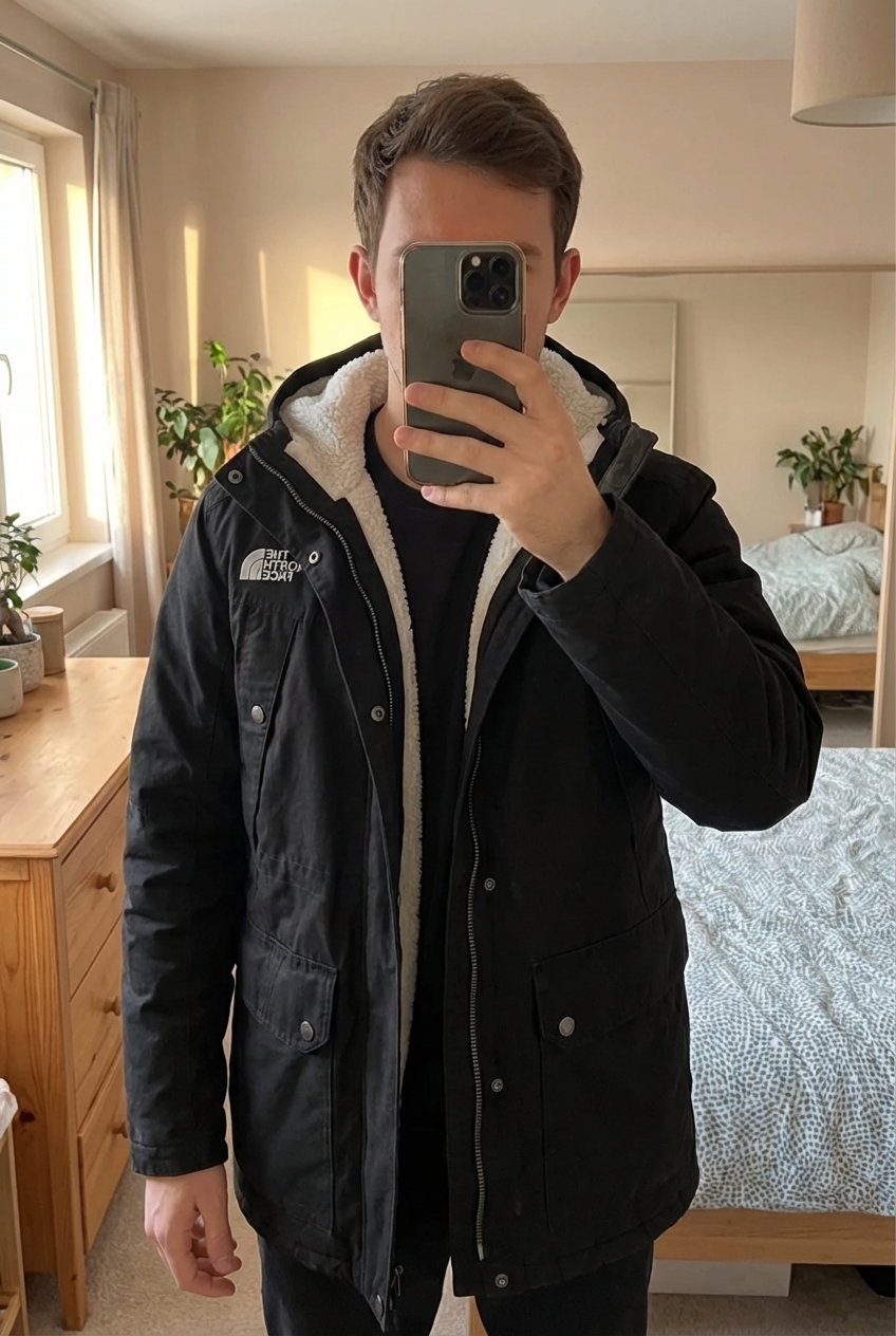 Parka The North Face Homme debout, face à la caméra, dans une chambre à la lumière douce, avec une lumière naturelle filtrant par la fenêtre.