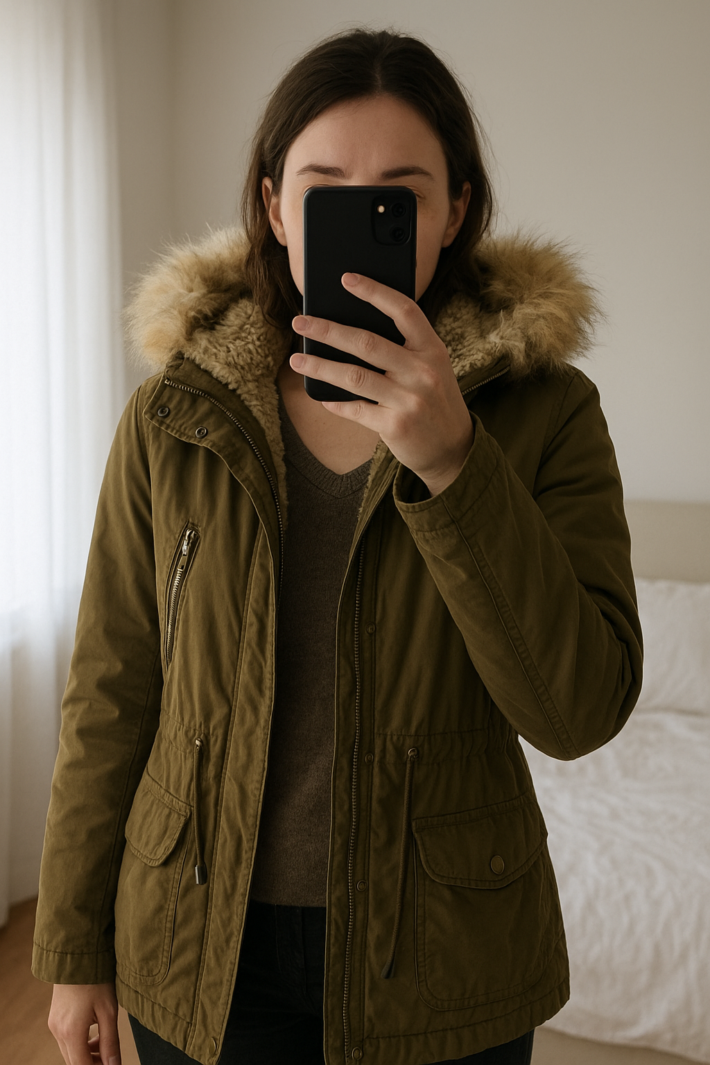 Parka Zara taille 38 debout, face à la caméra, dans une chambre à la lumière douce, avec une lumière naturelle filtrant par la fenêtre.
