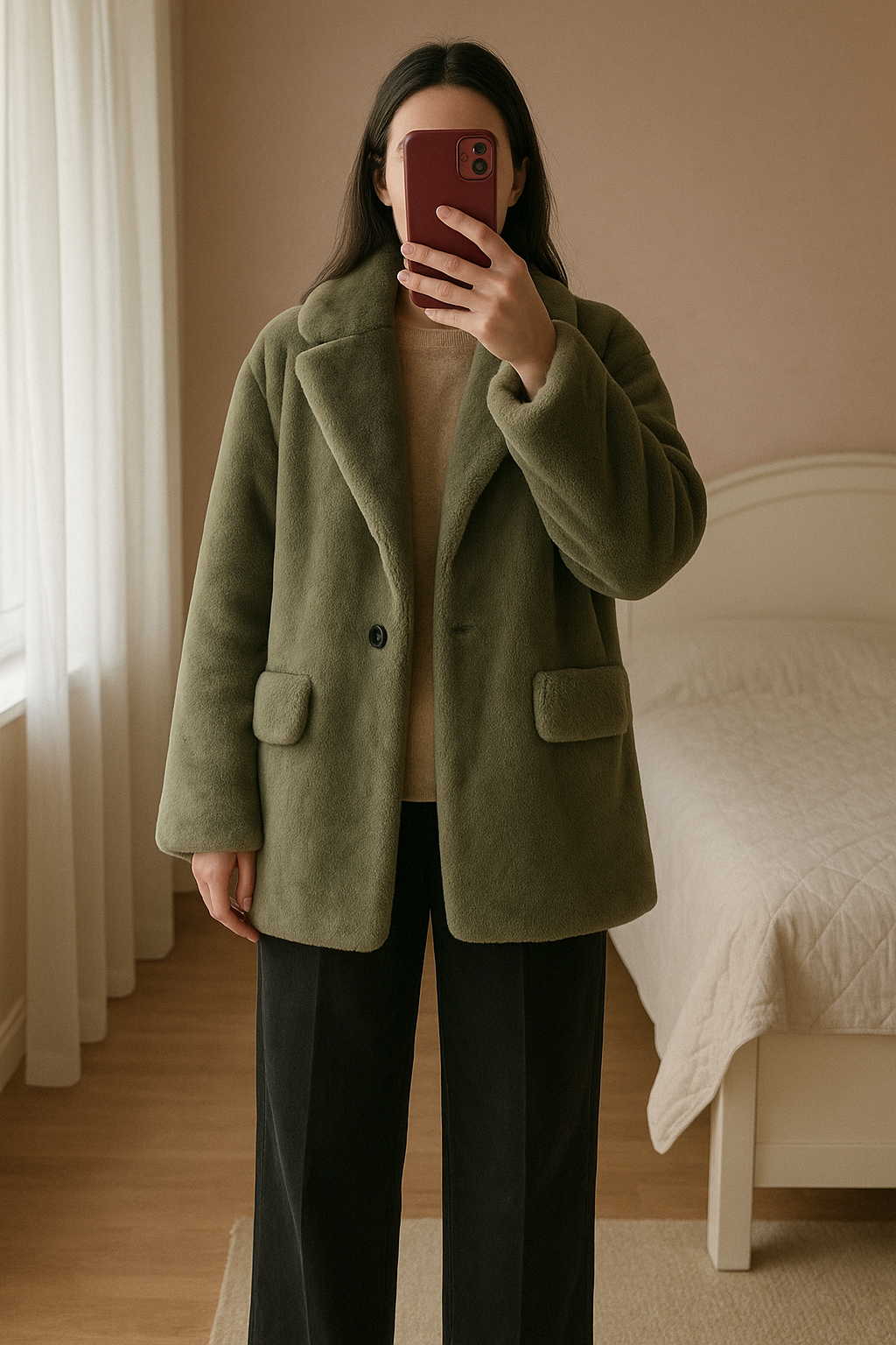 Pelliccia Pull&Bear taupe in piedi, rivolto verso la fotocamera, in una camera da letto con luce soffusa e luce naturale che filtra dalla finestra.