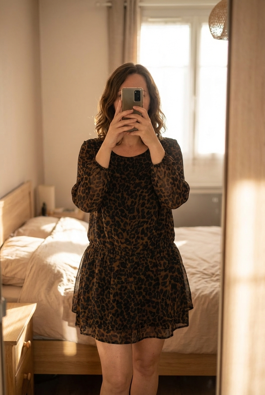 Petite robe léopard en mousseline, à volants debout, face à la caméra, dans une chambre à la lumière douce, avec une lumière naturelle filtrant par la fenêtre.