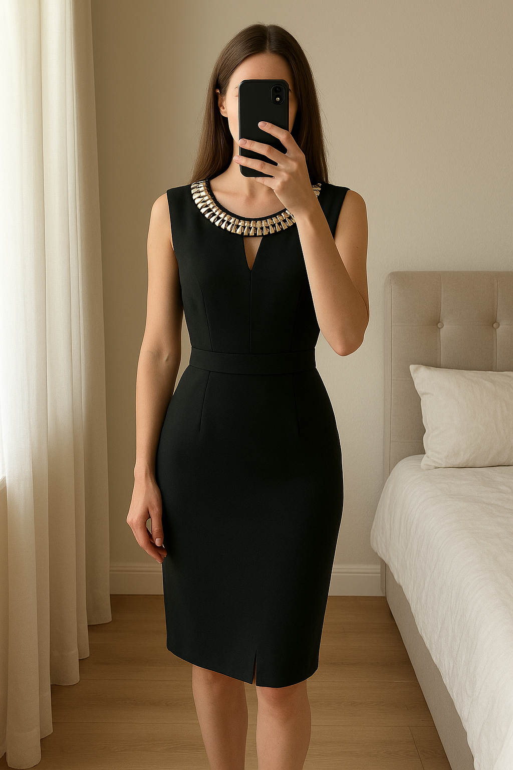 Petite robe noire Miss One ⭐ debout, face à la caméra, dans une chambre à la lumière douce, avec une lumière naturelle filtrant par la fenêtre.