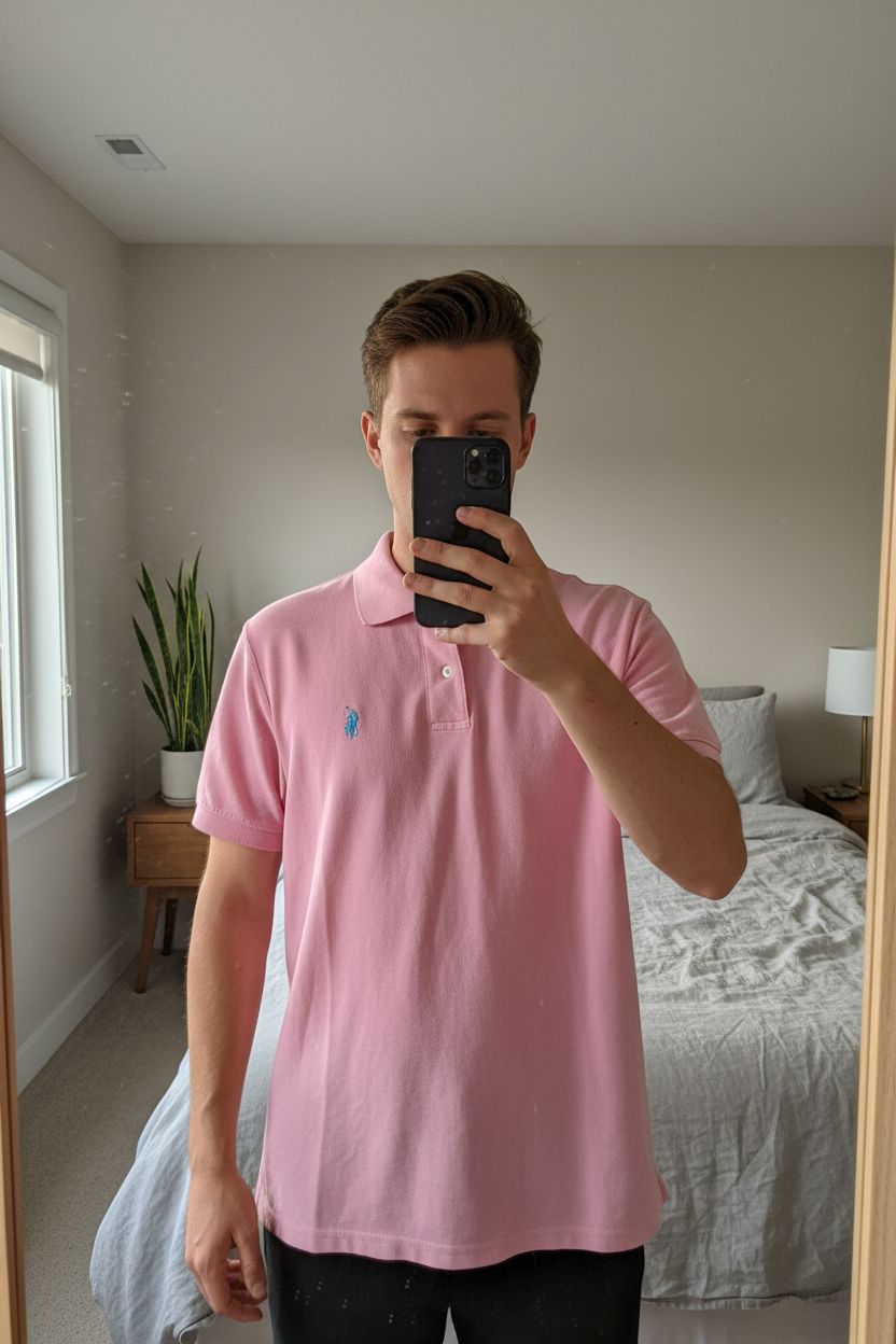 Pink Polo Ralph XL aufrecht stehend, der Kamera zugewandt, in einem sanft beleuchteten Schlafzimmer, mit natürlichem Licht, das durch ein Fenster fällt.
