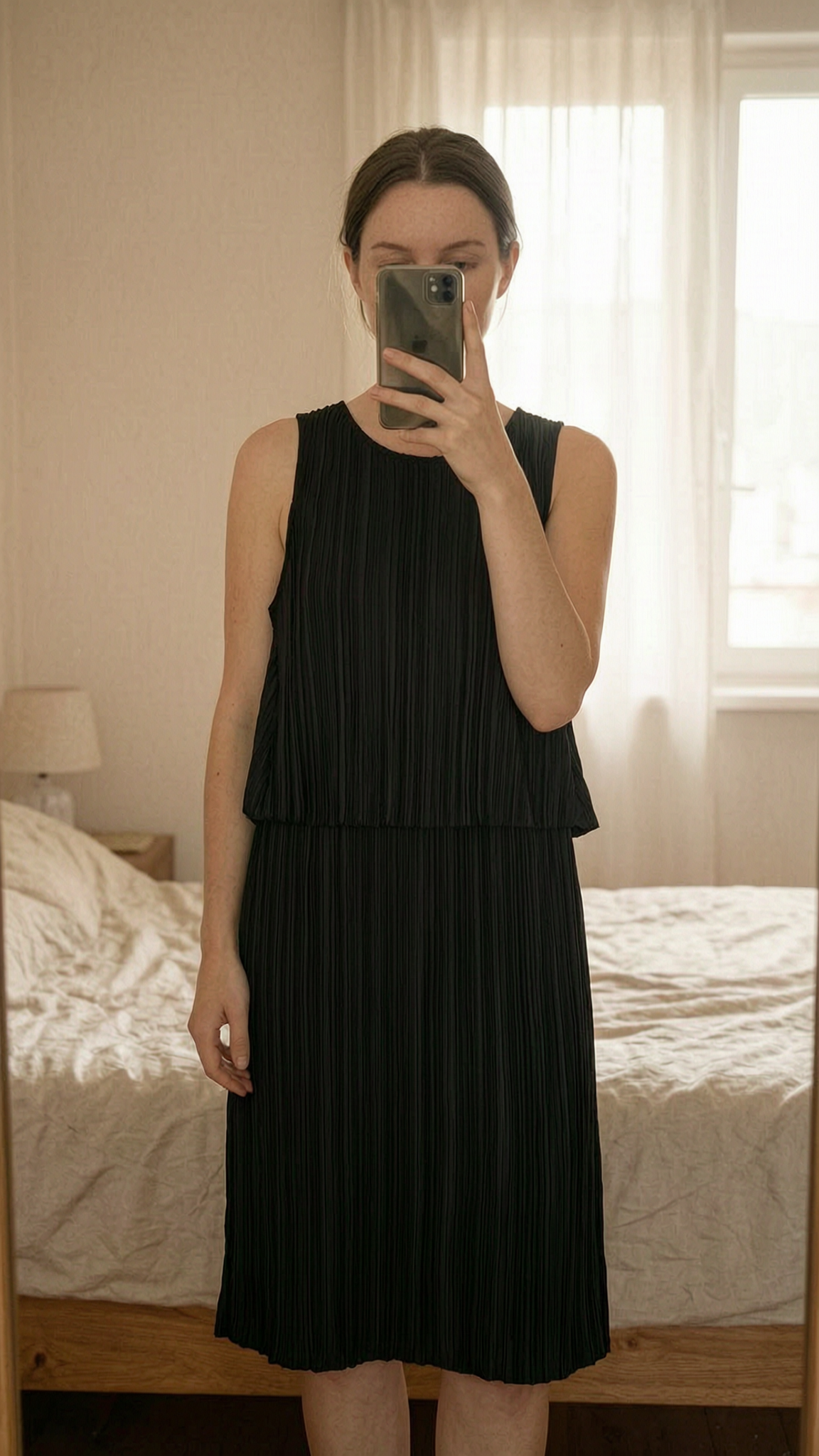 Plisseekleid schwarz (NEU) aufrecht stehend, der Kamera zugewandt, in einem sanft beleuchteten Schlafzimmer, mit natürlichem Licht, das durch ein Fenster fällt.