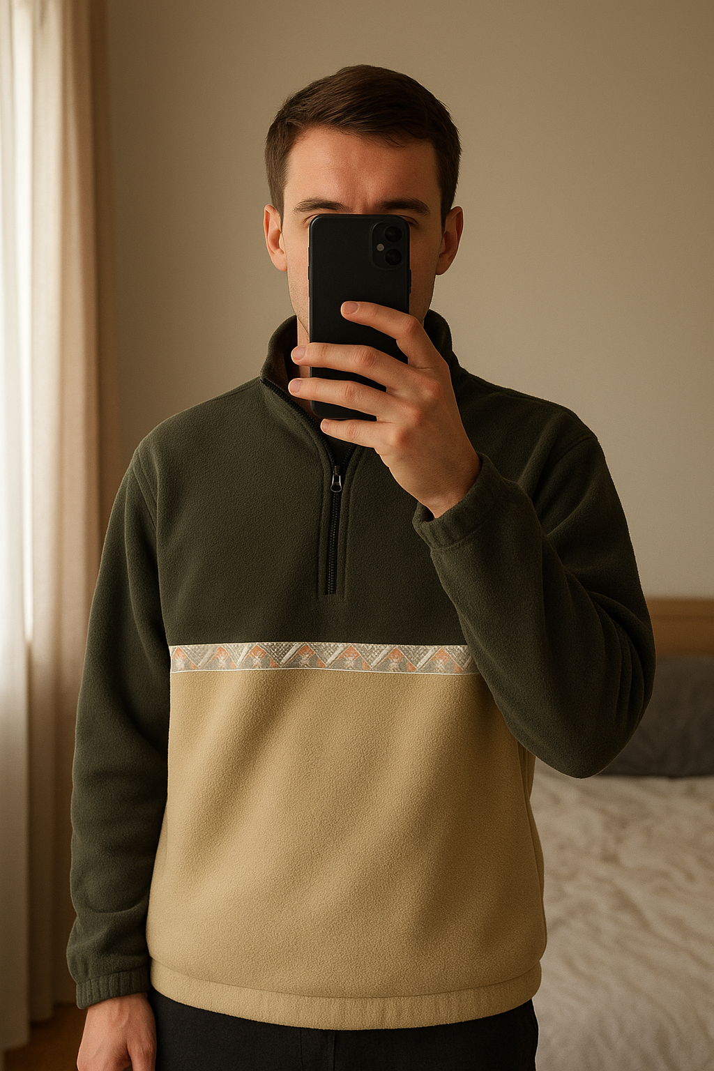 Polaire Bizzbee Homme – Taille L – Kaki & Beige debout, face à la caméra, dans une chambre à la lumière douce, avec une lumière naturelle filtrant par la fenêtre.
