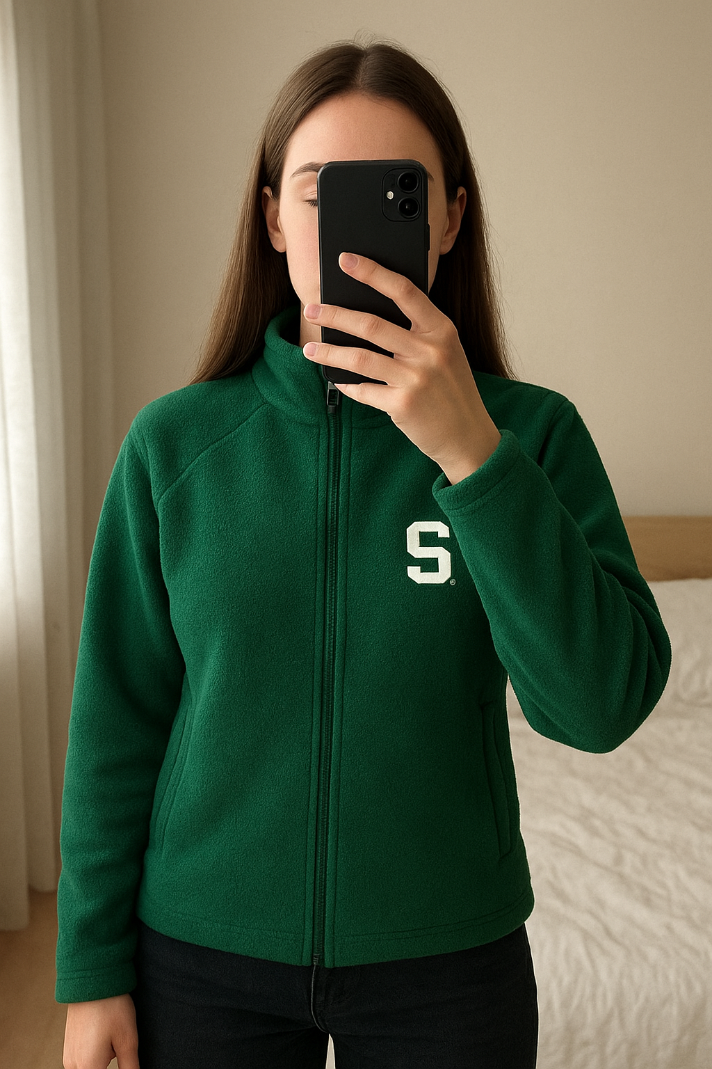 Polaire Columbia – Femme – Taille L – Verte debout, face à la caméra, dans une chambre à la lumière douce, avec une lumière naturelle filtrant par la fenêtre.