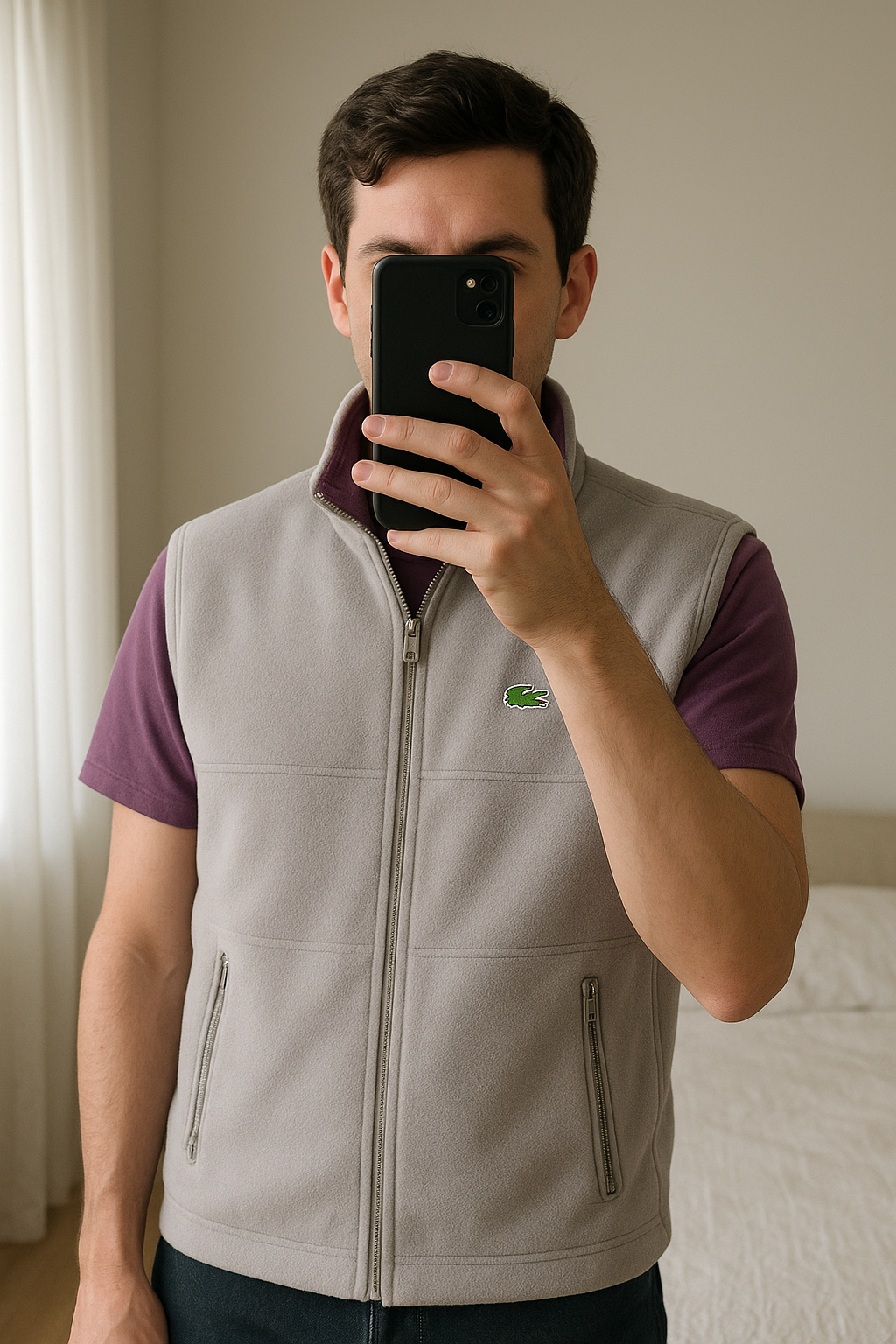 Polaire sans manche Lacoste M debout, face à la caméra, dans une chambre à la lumière douce, avec une lumière naturelle filtrant par la fenêtre.