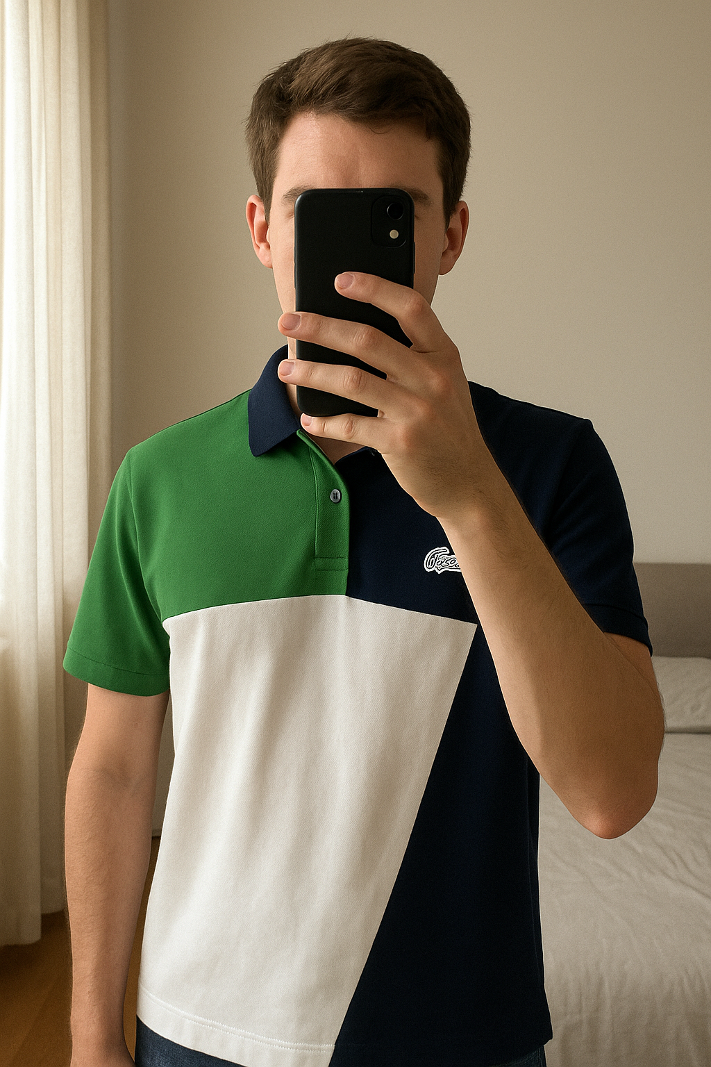 polo lacoste roland garros tri colore taille m fr4 debout, face à la caméra, dans une chambre à la lumière douce, avec une lumière naturelle filtrant par la fenêtre.