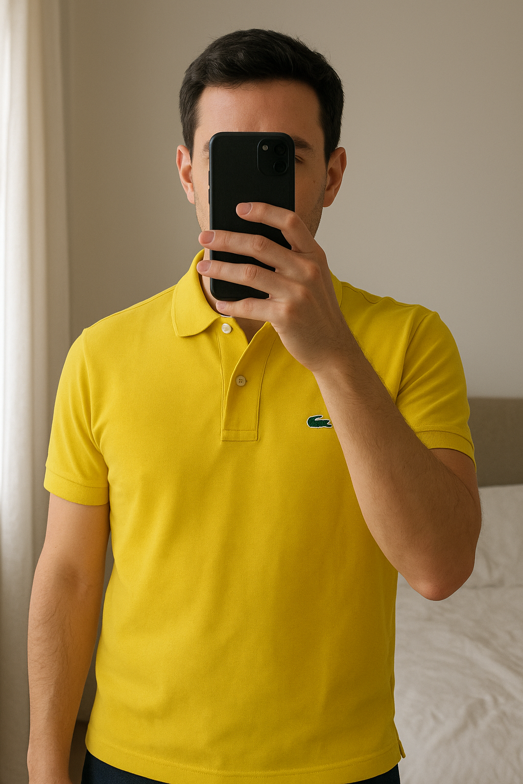 Polo Lacoste taille L debout, face à la caméra, dans une chambre à la lumière douce, avec une lumière naturelle filtrant par la fenêtre.