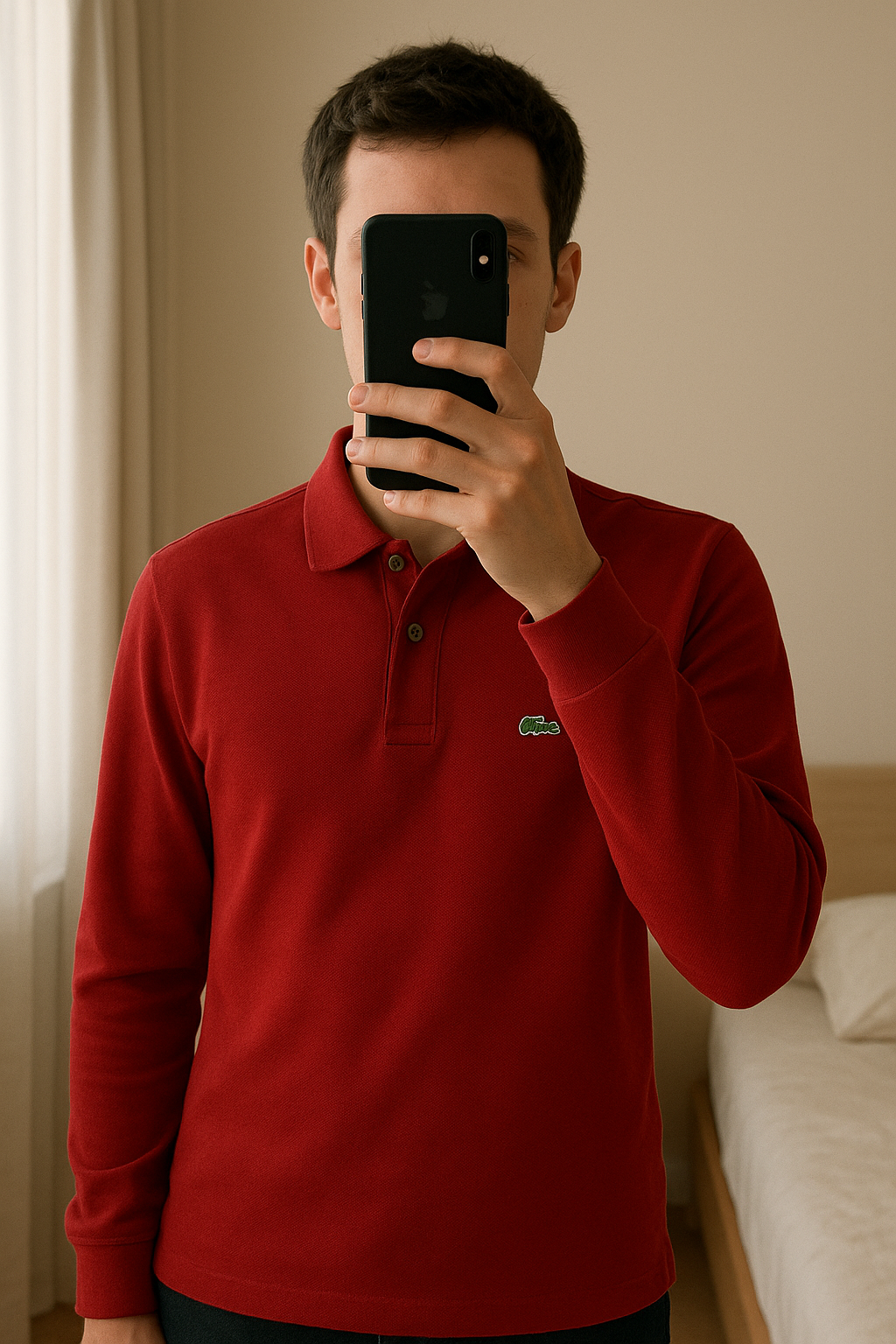 Polo manche longue Lacoste debout, face à la caméra, dans une chambre à la lumière douce, avec une lumière naturelle filtrant par la fenêtre.