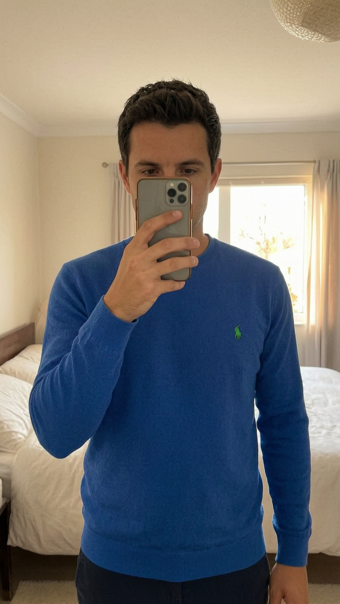 Une personne en Polo Ralph Lauren bleu taille XL debout, face à la caméra, dans une chambre à la lumière douce, avec une lumière naturelle filtrant par la fenêtre.
