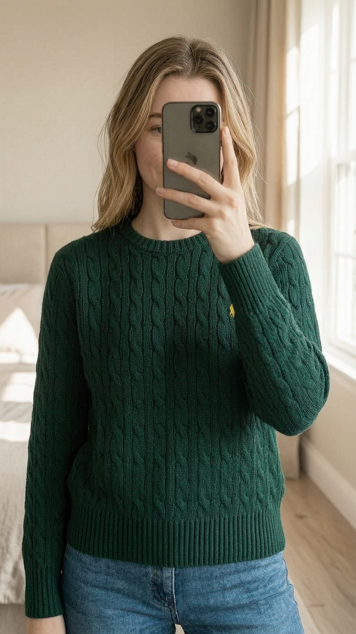 | Polo Ralph Lauren | Green Cable Knit Sweater | Old Money Y2K | XS | Nr.6 aufrecht stehend, der Kamera zugewandt, in einem sanft beleuchteten Schlafzimmer, mit natürlichem Licht, das durch ein Fenster fällt.