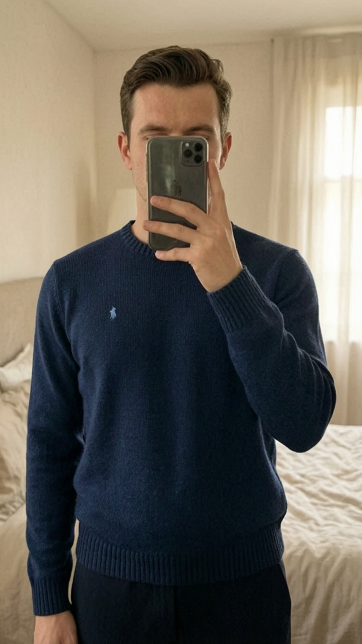 Polo Ralph Lauren Navy Knit Pullover | Classic Streetwear Essential aufrecht stehend, der Kamera zugewandt, in einem sanft beleuchteten Schlafzimmer, mit natürlichem Licht, das durch ein Fenster fällt.