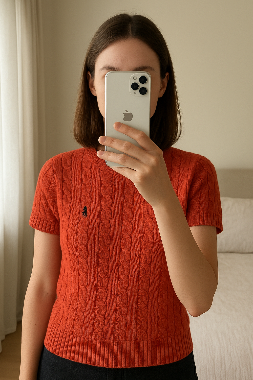 Polo ralph Lauren rouge debout, face à la caméra, dans une chambre à la lumière douce, avec une lumière naturelle filtrant par la fenêtre.