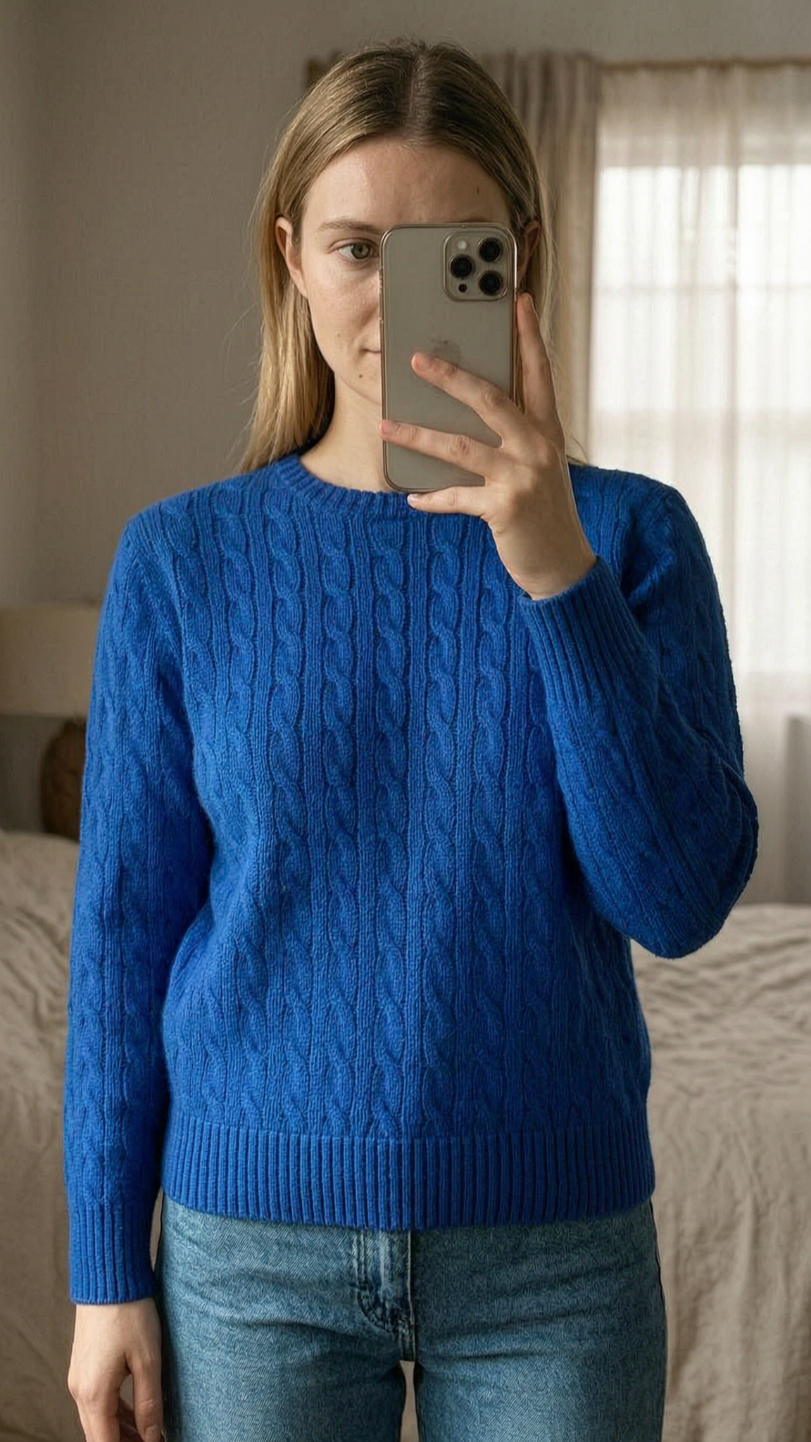 | Polo Ralph Lauren | Royal Blue Cable Knit | Old Money Y2K | S | Nr.10 aufrecht stehend, der Kamera zugewandt, in einem sanft beleuchteten Schlafzimmer, mit natürlichem Licht, das durch ein Fenster fällt.