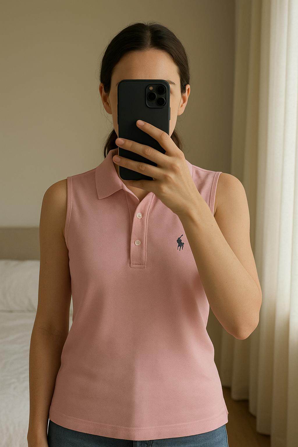 Polo sans manches debout, face à la caméra, dans une chambre à la lumière douce, avec une lumière naturelle filtrant par la fenêtre.