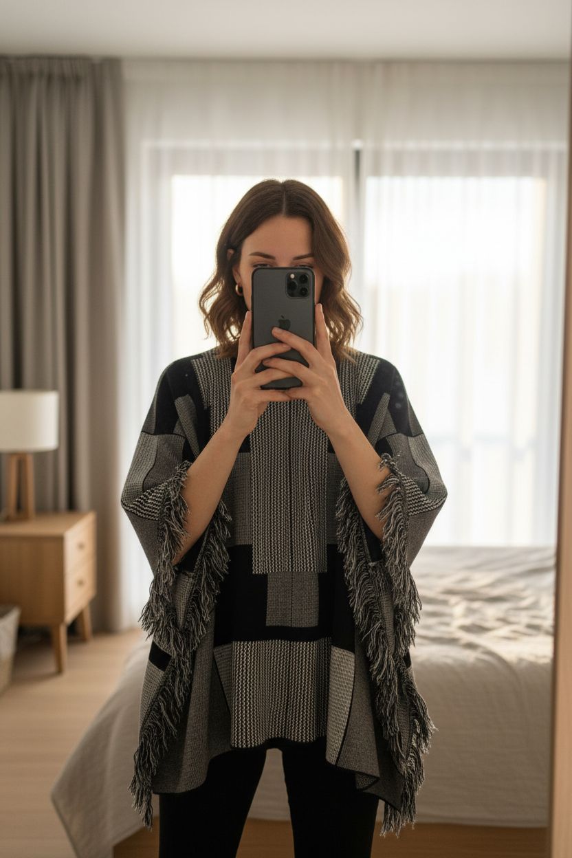 Poncho taille 40 debout, face à la caméra, dans une chambre à la lumière douce, avec une lumière naturelle filtrant par la fenêtre.