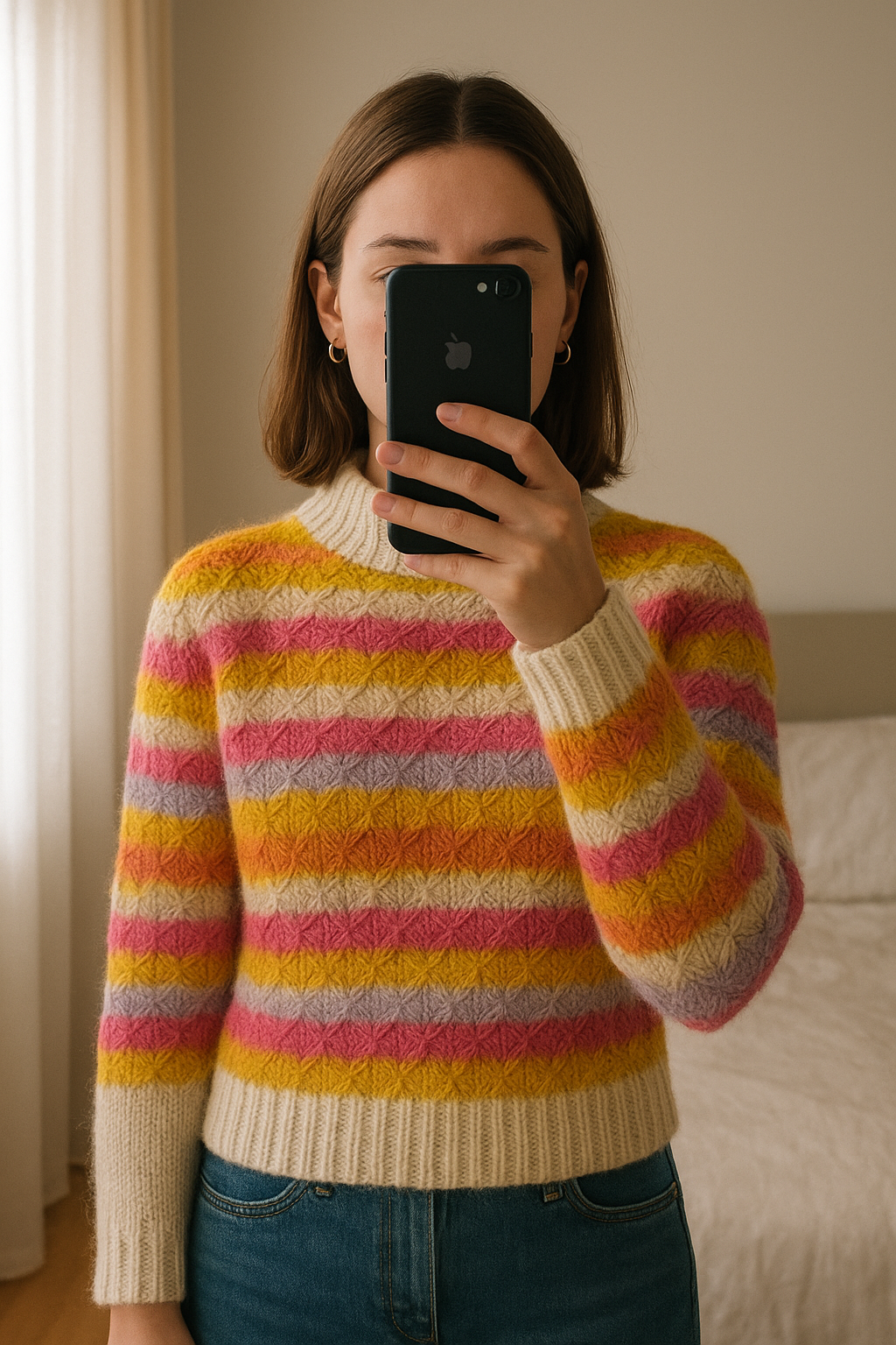 Pull arc-en-ciel Zara debout, face à la caméra, dans une chambre à la lumière douce, avec une lumière naturelle filtrant par la fenêtre.