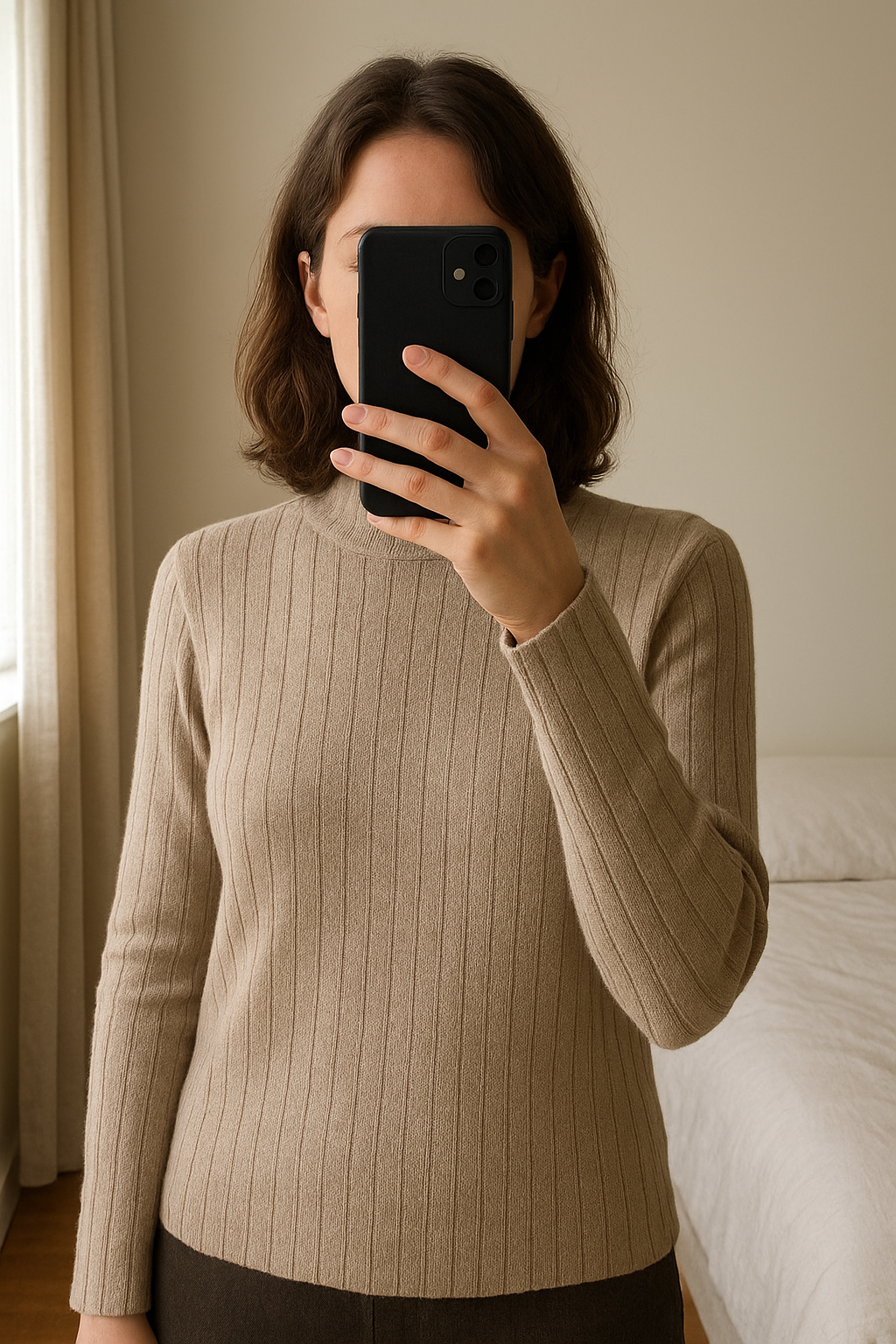 Pull beige en 44 debout, face à la caméra, dans une chambre à la lumière douce, avec une lumière naturelle filtrant par la fenêtre.