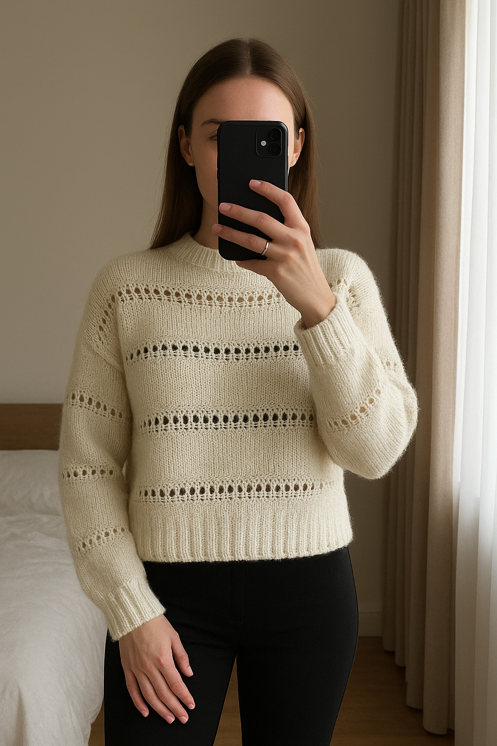 Pull Bershka tendance actuelle debout, face à la caméra, dans une chambre à la lumière douce, avec une lumière naturelle filtrant par la fenêtre.