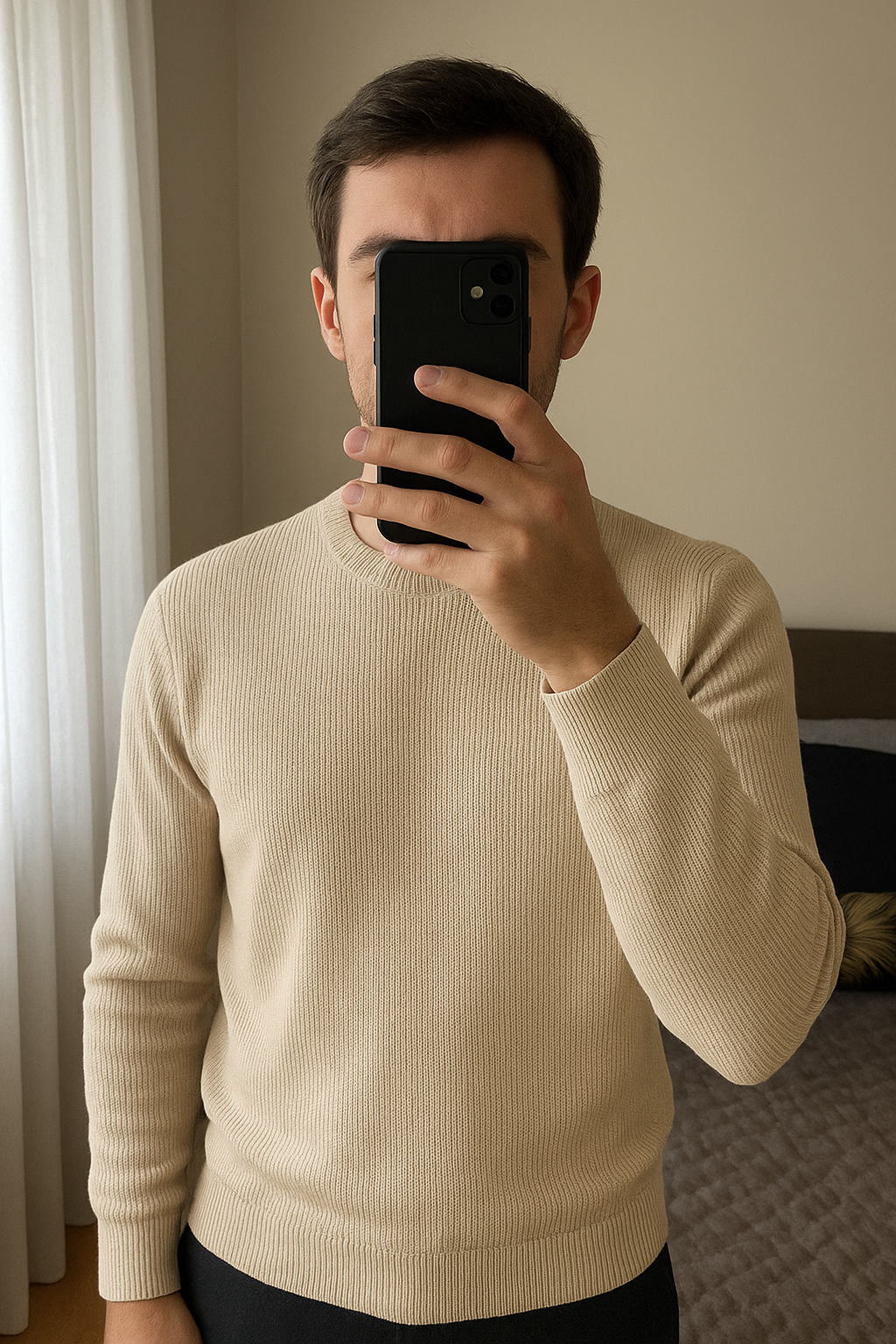 Pull Bizzbee – Blanc – Taille L debout, face à la caméra, dans une chambre à la lumière douce, avec une lumière naturelle filtrant par la fenêtre.