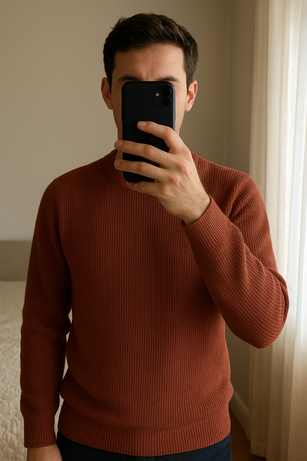 Pull Bizzbee – Marron – Taille L debout, face à la caméra, dans une chambre à la lumière douce, avec une lumière naturelle filtrant par la fenêtre.