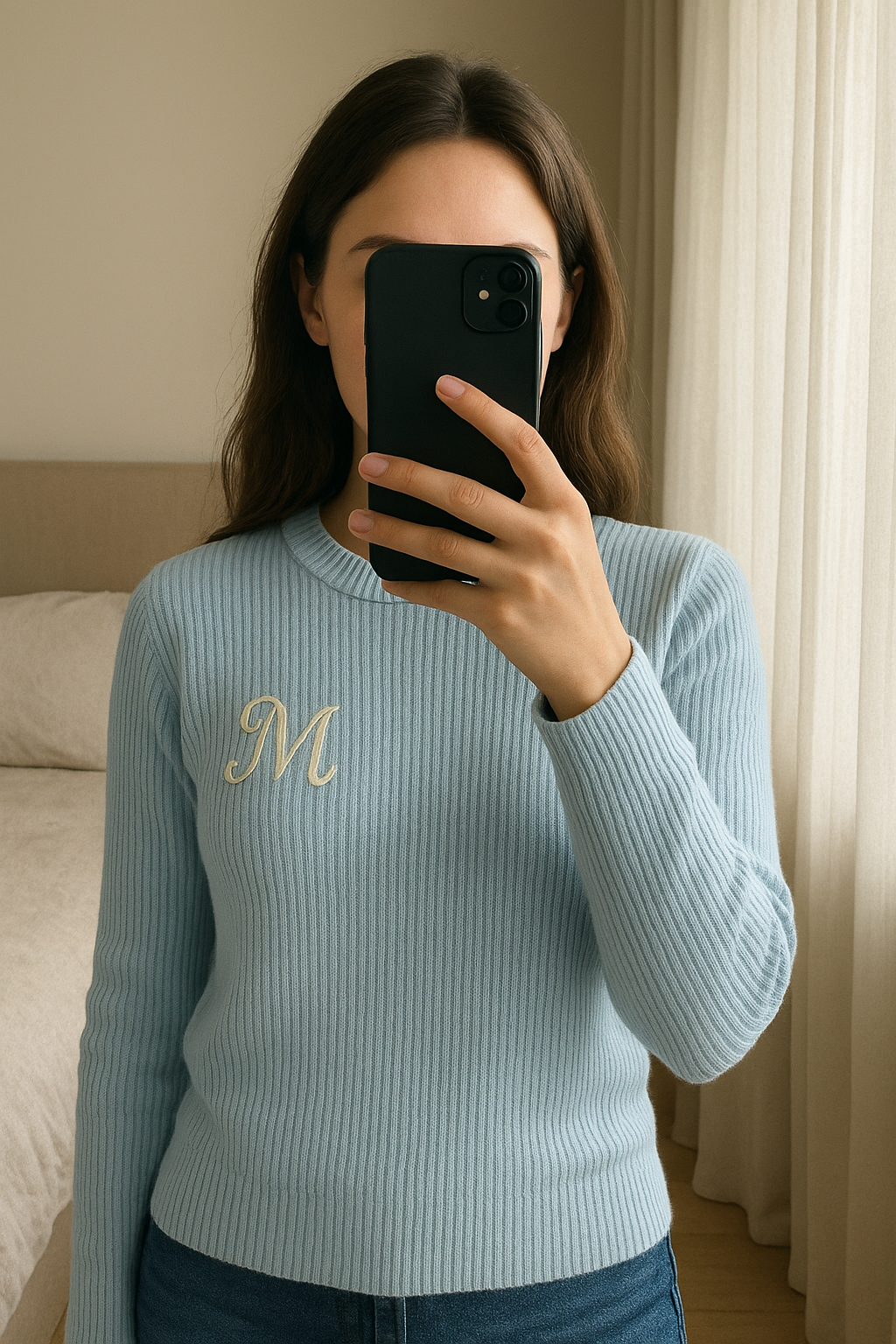 Pull bleu ciel vintage à col haut debout, face à la caméra, dans une chambre à la lumière douce, avec une lumière naturelle filtrant par la fenêtre.