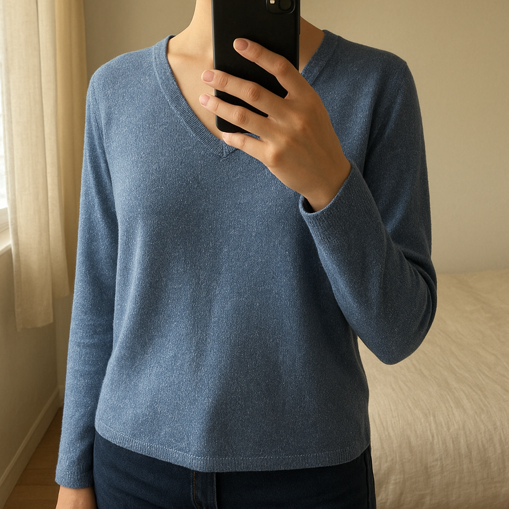 Pull bleu pailleté debout, face à la caméra, dans une chambre à la lumière douce, avec une lumière naturelle filtrant par la fenêtre.