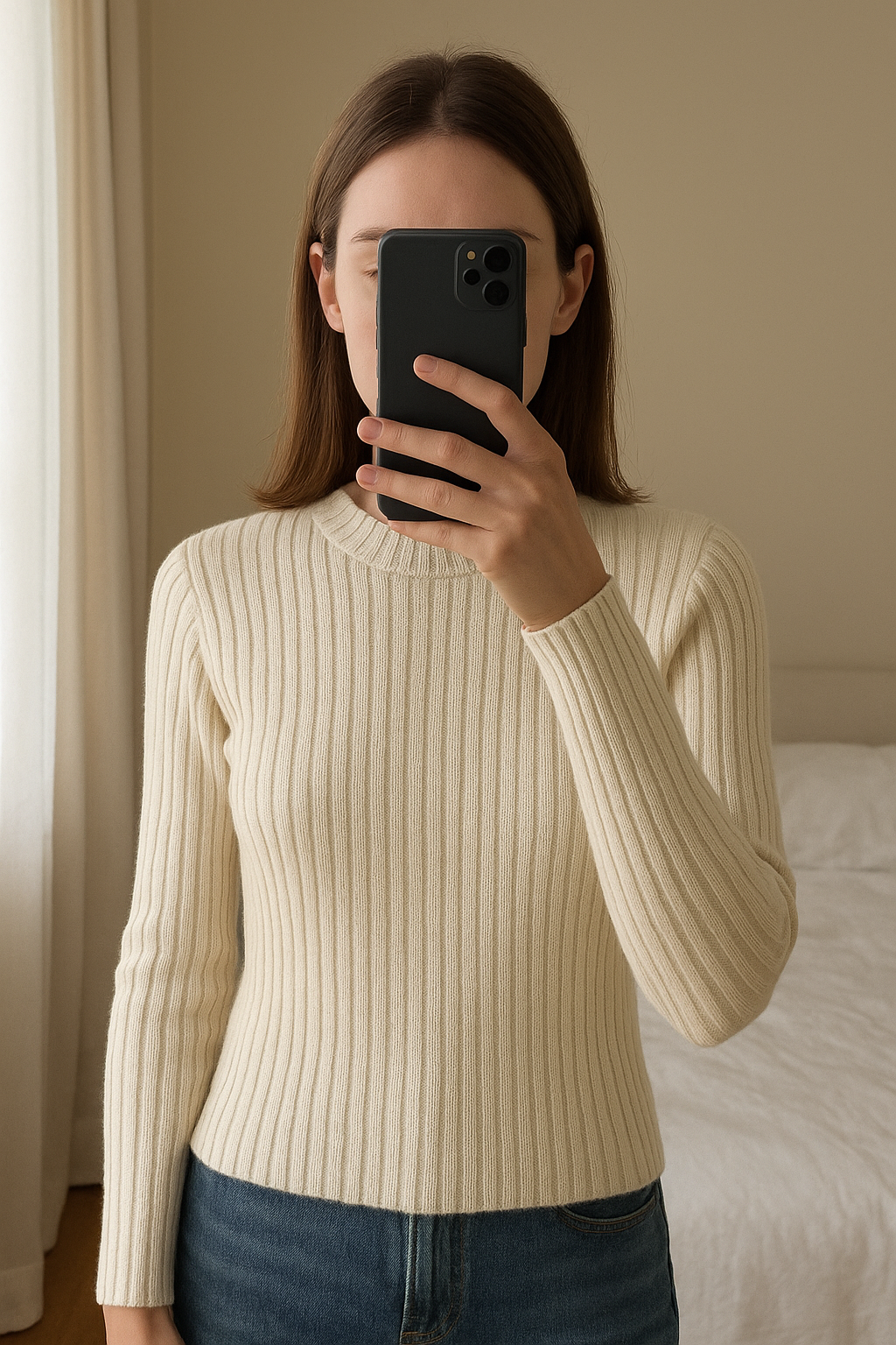 Pull Calvin Klein neuf avec étiquette debout, face à la caméra, dans une chambre à la lumière douce, avec une lumière naturelle filtrant par la fenêtre.