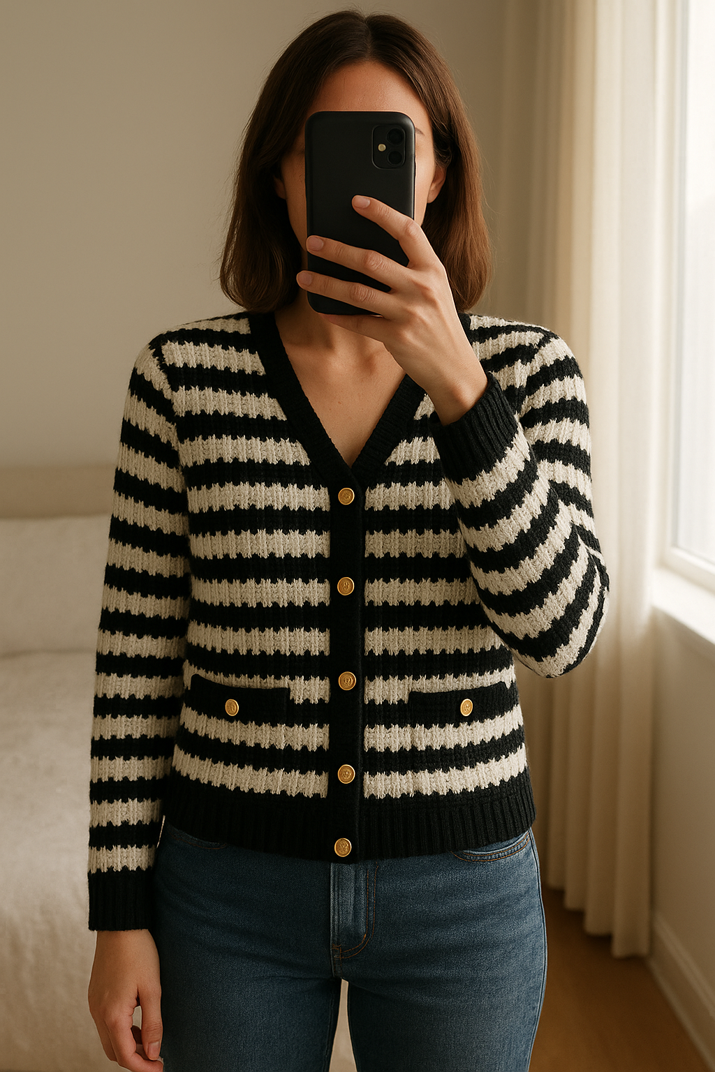 Pull Cardigans debout, face à la caméra, dans une chambre à la lumière douce, avec une lumière naturelle filtrant par la fenêtre.