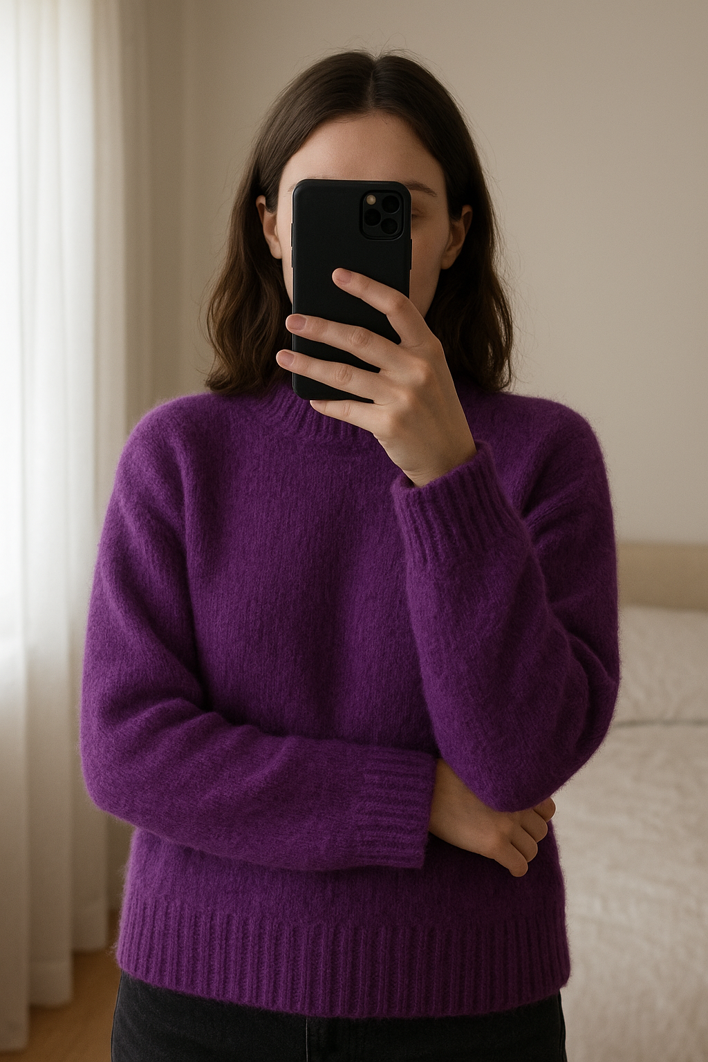 Pull col montant Sezane debout, face à la caméra, dans une chambre à la lumière douce, avec une lumière naturelle filtrant par la fenêtre.
