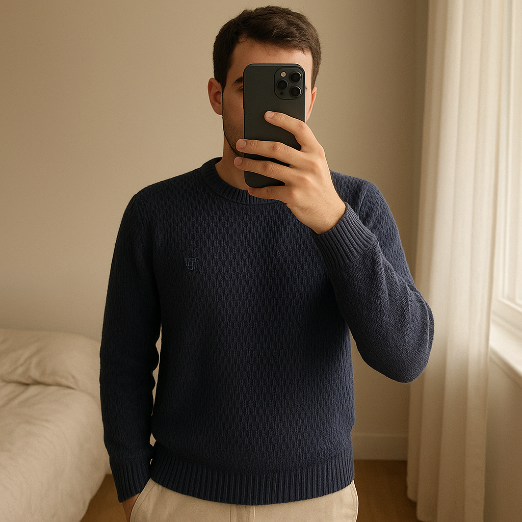 Pull Col Rond Torsadé GANT Bleu Marine M debout, face à la caméra, dans une chambre à la lumière douce, avec une lumière naturelle filtrant par la fenêtre.