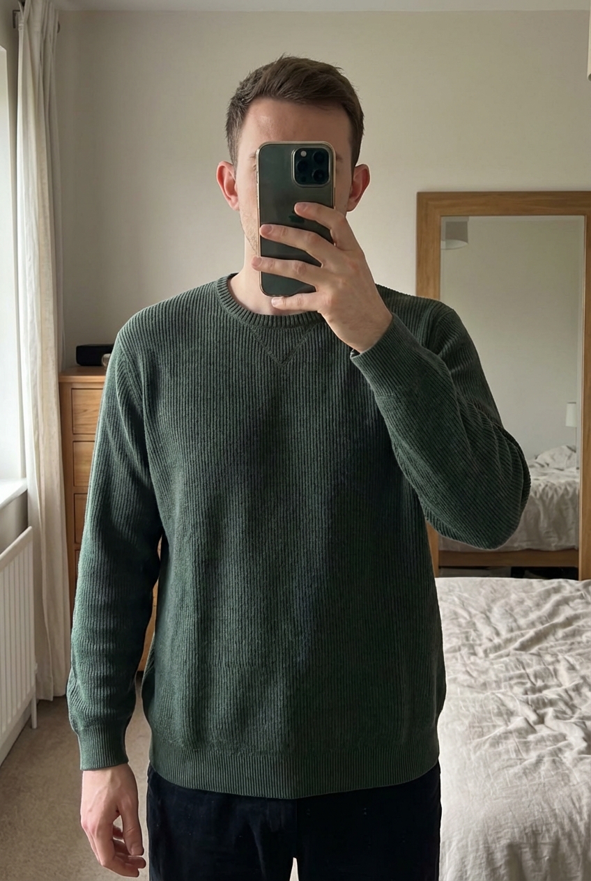 Pull Col Rond Vintage Y2K 100% Coton Eddie Bauer Vert XL debout, face à la caméra, dans une chambre à la lumière douce, avec une lumière naturelle filtrant par la fenêtre.