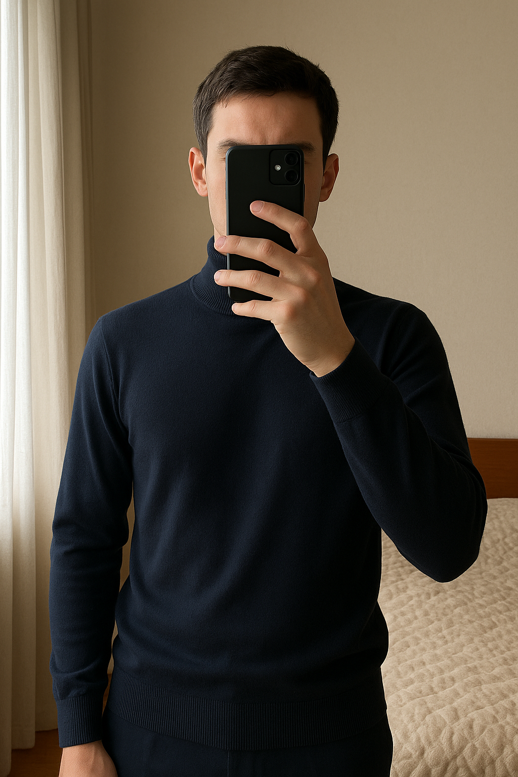 Pull col roulé bleu marine - Bizzbee - Taille M debout, face à la caméra, dans une chambre à la lumière douce, avec une lumière naturelle filtrant par la fenêtre.