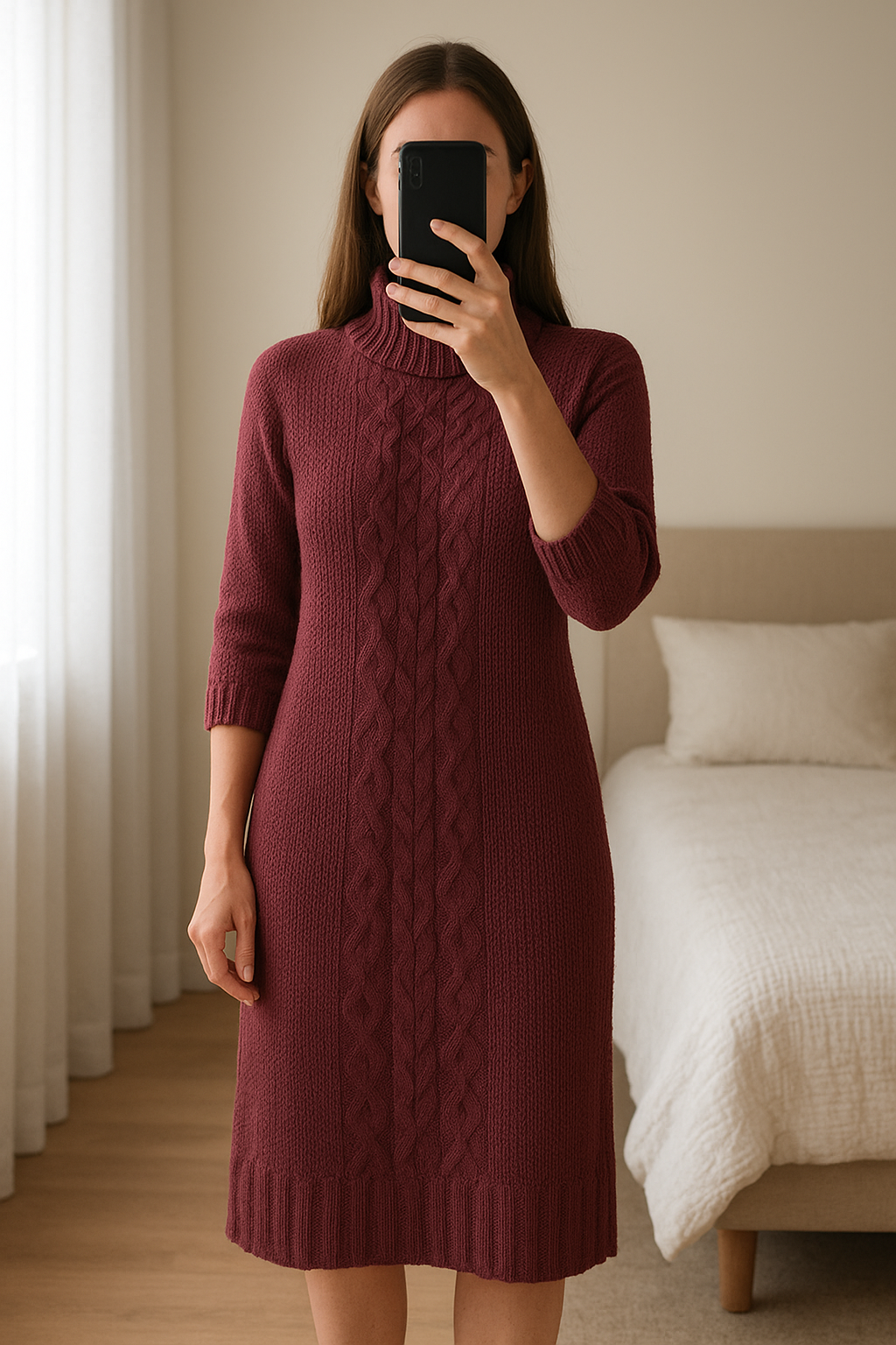 Pull Col Roulé Bordeau Femme - Taille S debout, face à la caméra, dans une chambre à la lumière douce, avec une lumière naturelle filtrant par la fenêtre.