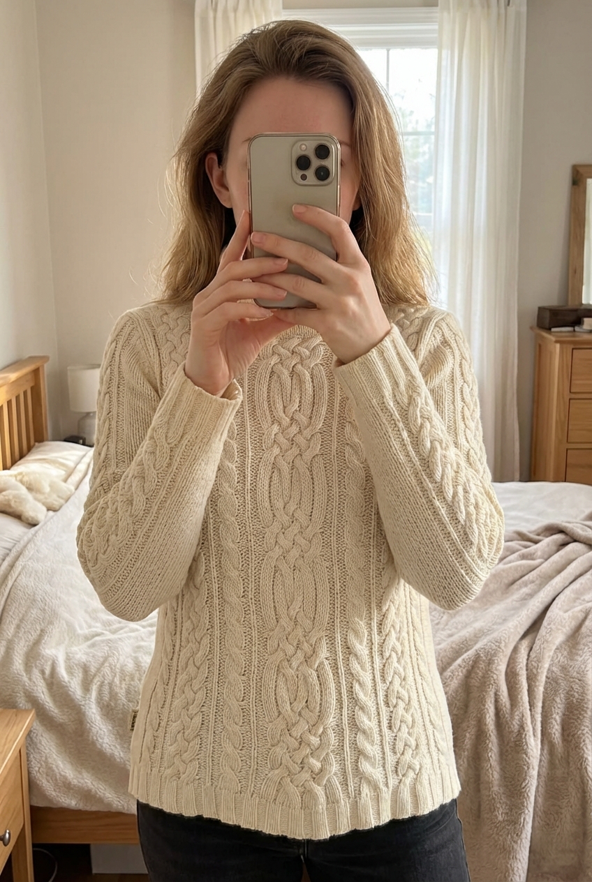 Une personne en Pull Col roulé Fait Main Tricot Aran Wool Sweater 100% Laine Blanc crème Aran Craft M debout, face à la caméra, dans une chambre à la lumière douce, avec une lumière naturelle filtrant par la fenêtre.