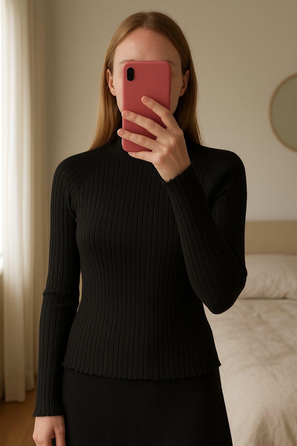 Pull col roulé noir côtelé – Taille S debout, face à la caméra, dans une chambre à la lumière douce, avec une lumière naturelle filtrant par la fenêtre.