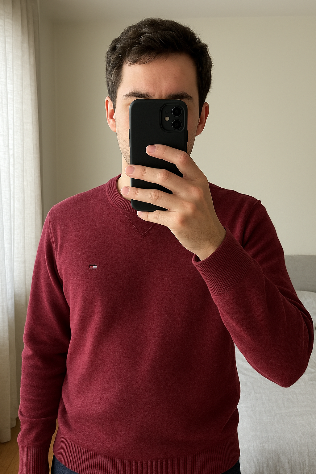 Pull Col V Tommy Hilfiger 100% coton Rouge Bordeaux L debout, face à la caméra, dans une chambre à la lumière douce, avec une lumière naturelle filtrant par la fenêtre.