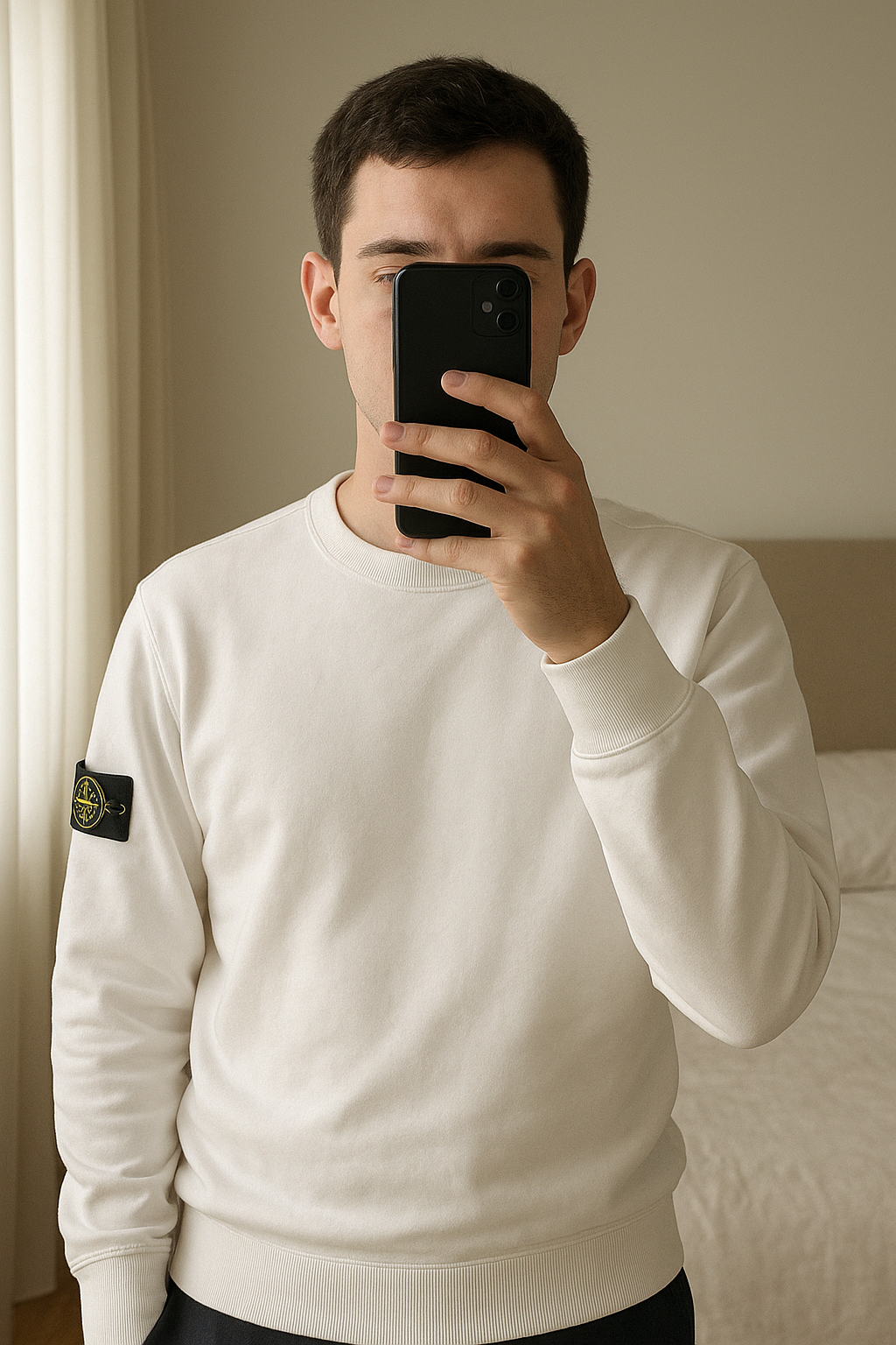 Pull crewneck Stone Island debout, face à la caméra, dans une chambre à la lumière douce, avec une lumière naturelle filtrant par la fenêtre.