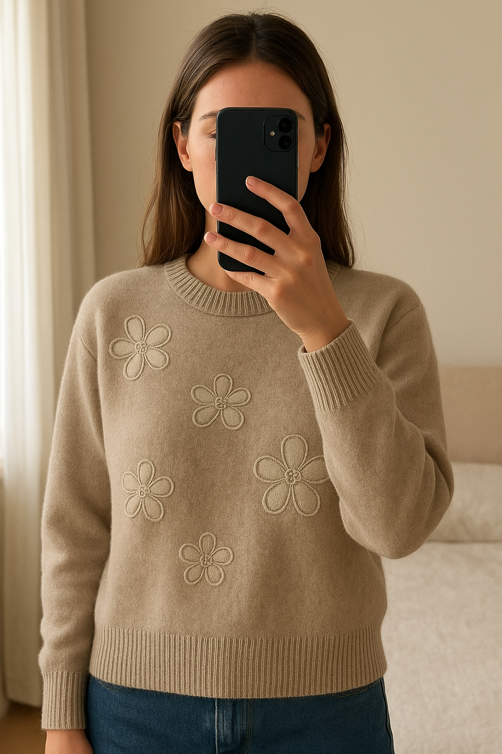 Pull doux beige à fleurs brodées debout, face à la caméra, dans une chambre à la lumière douce, avec une lumière naturelle filtrant par la fenêtre.