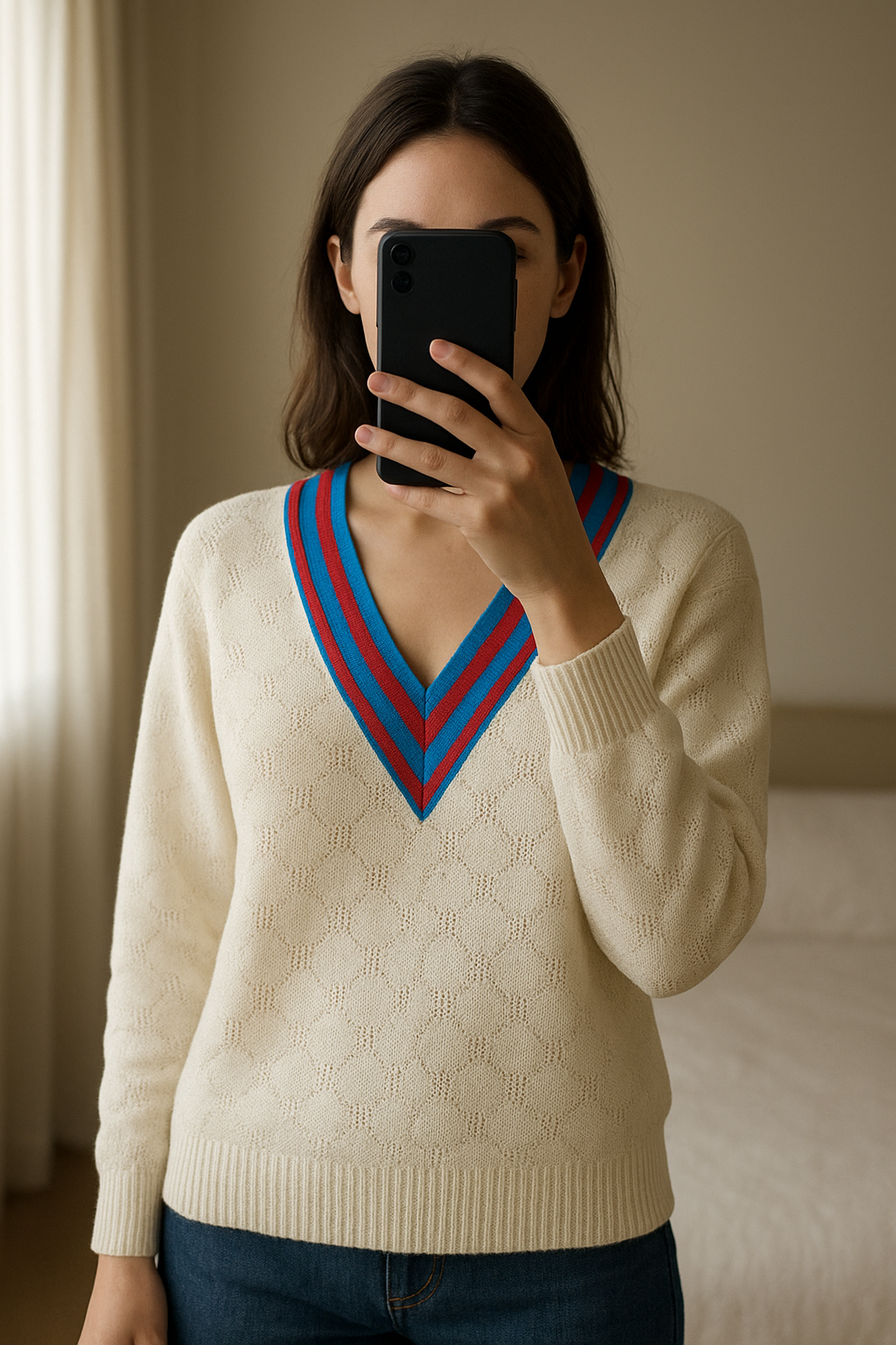 Pull en laine cachemire Sandro ecru T38 neuf debout, face à la caméra, dans une chambre à la lumière douce, avec une lumière naturelle filtrant par la fenêtre.