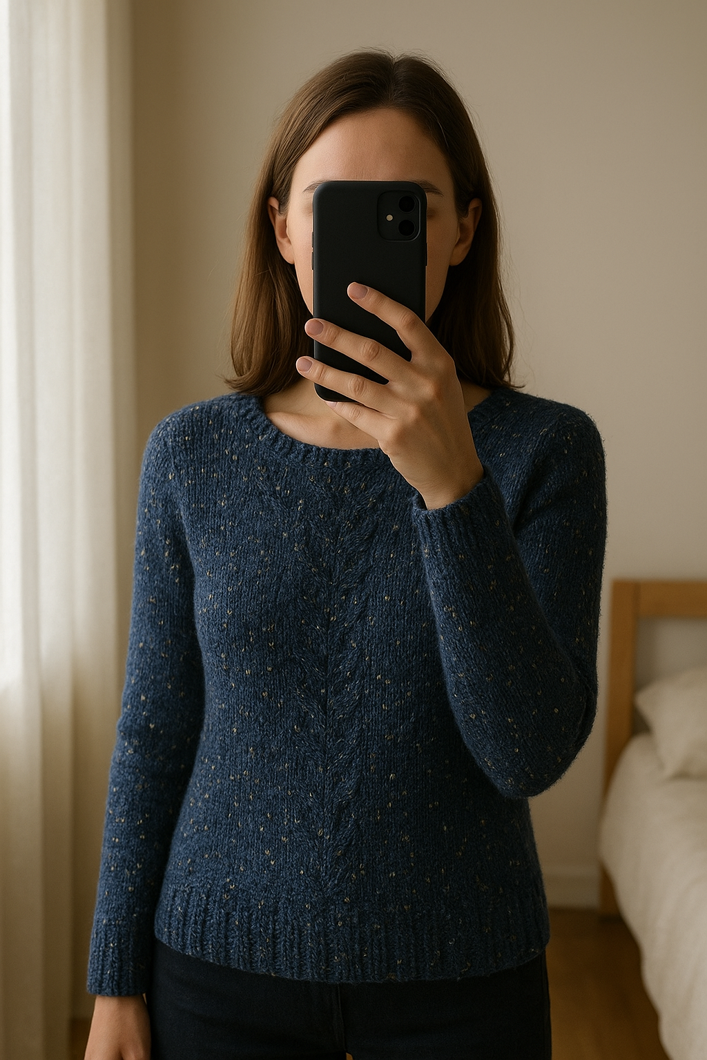 Pull en laine marine debout, face à la caméra, dans une chambre à la lumière douce, avec une lumière naturelle filtrant par la fenêtre.