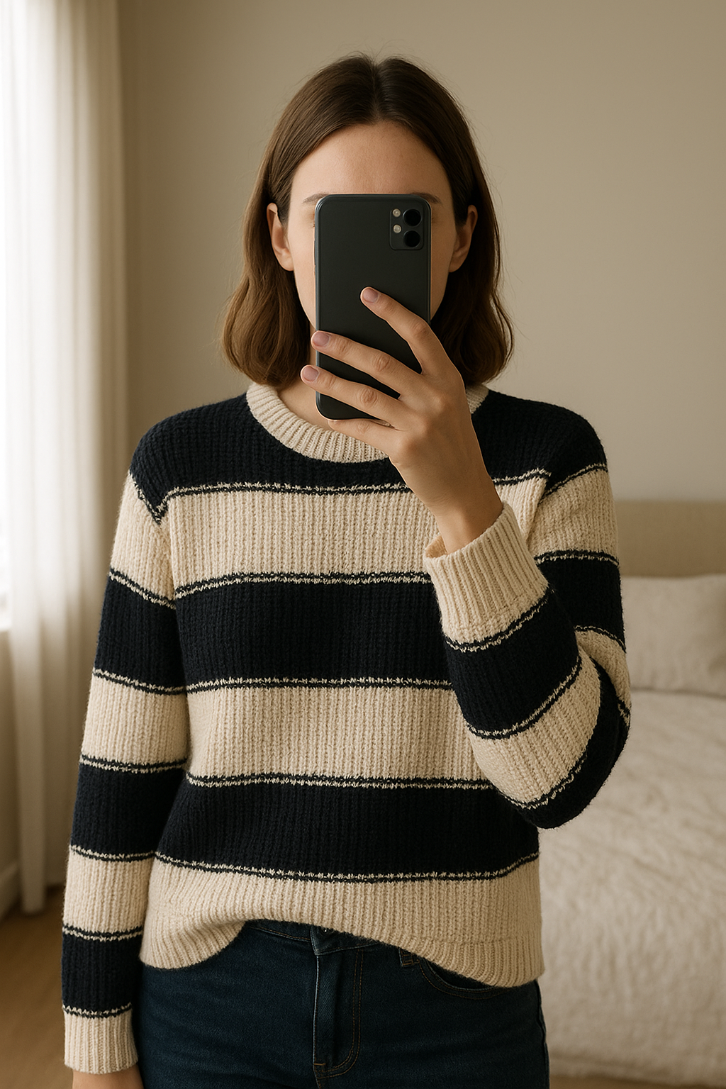 Pull en laine, pimkie, S debout, face à la caméra, dans une chambre à la lumière douce, avec une lumière naturelle filtrant par la fenêtre.
