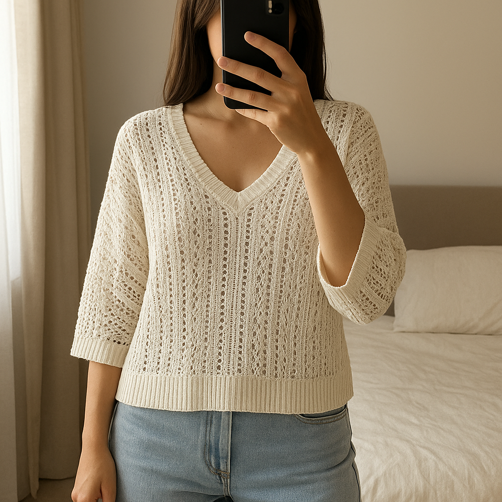 Pull en maille debout, face à la caméra, dans une chambre à la lumière douce, avec une lumière naturelle filtrant par la fenêtre.