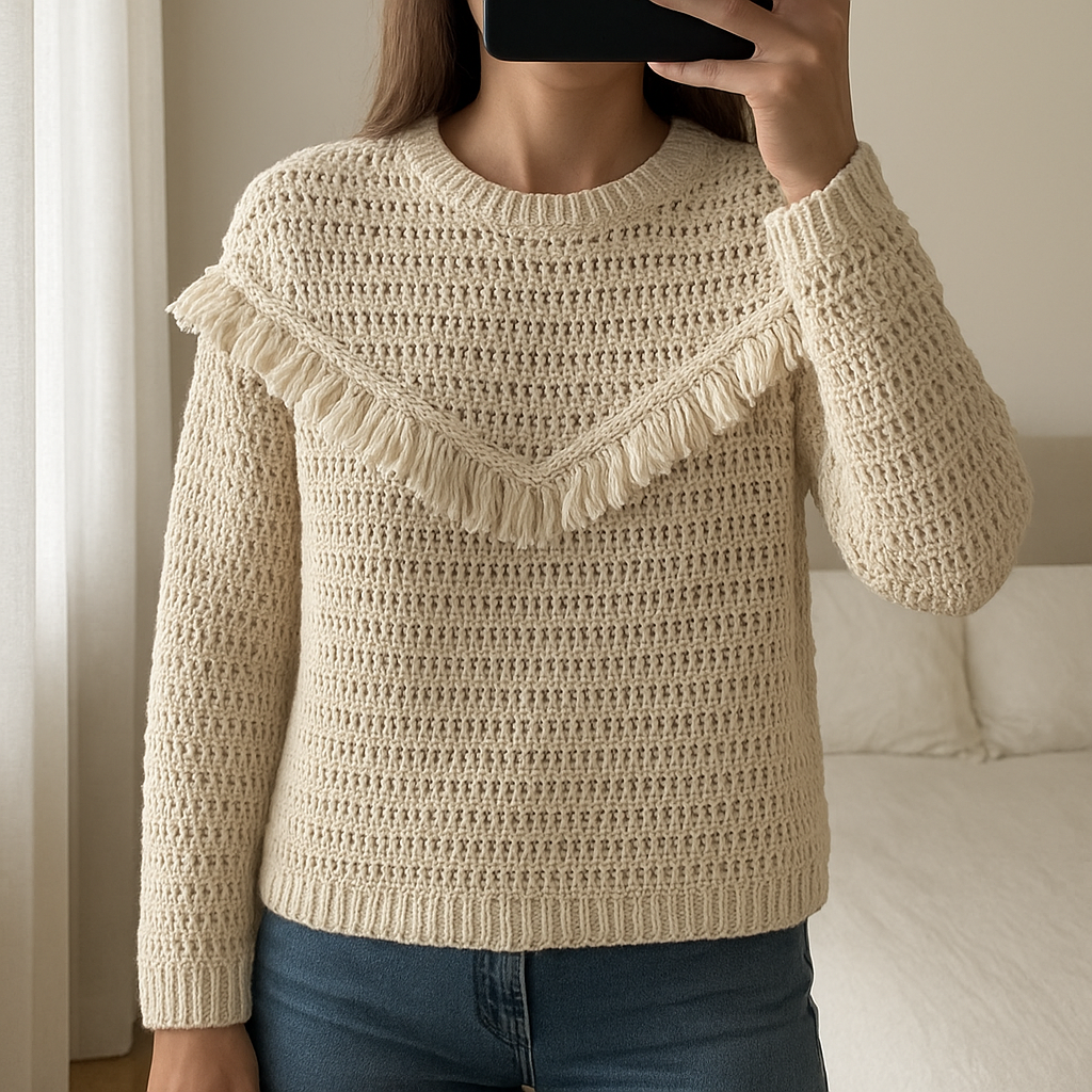 Pull en maille Sezane debout, face à la caméra, dans une chambre à la lumière douce, avec une lumière naturelle filtrant par la fenêtre.
