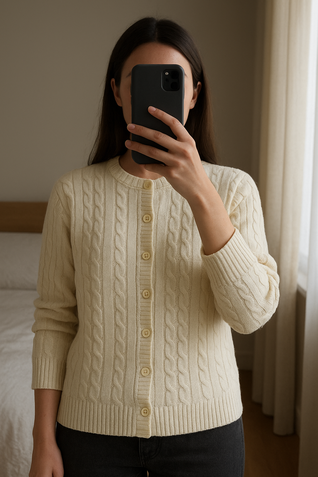 Pull Femme Blanc - Taille 2XL debout, face à la caméra, dans une chambre à la lumière douce, avec une lumière naturelle filtrant par la fenêtre.