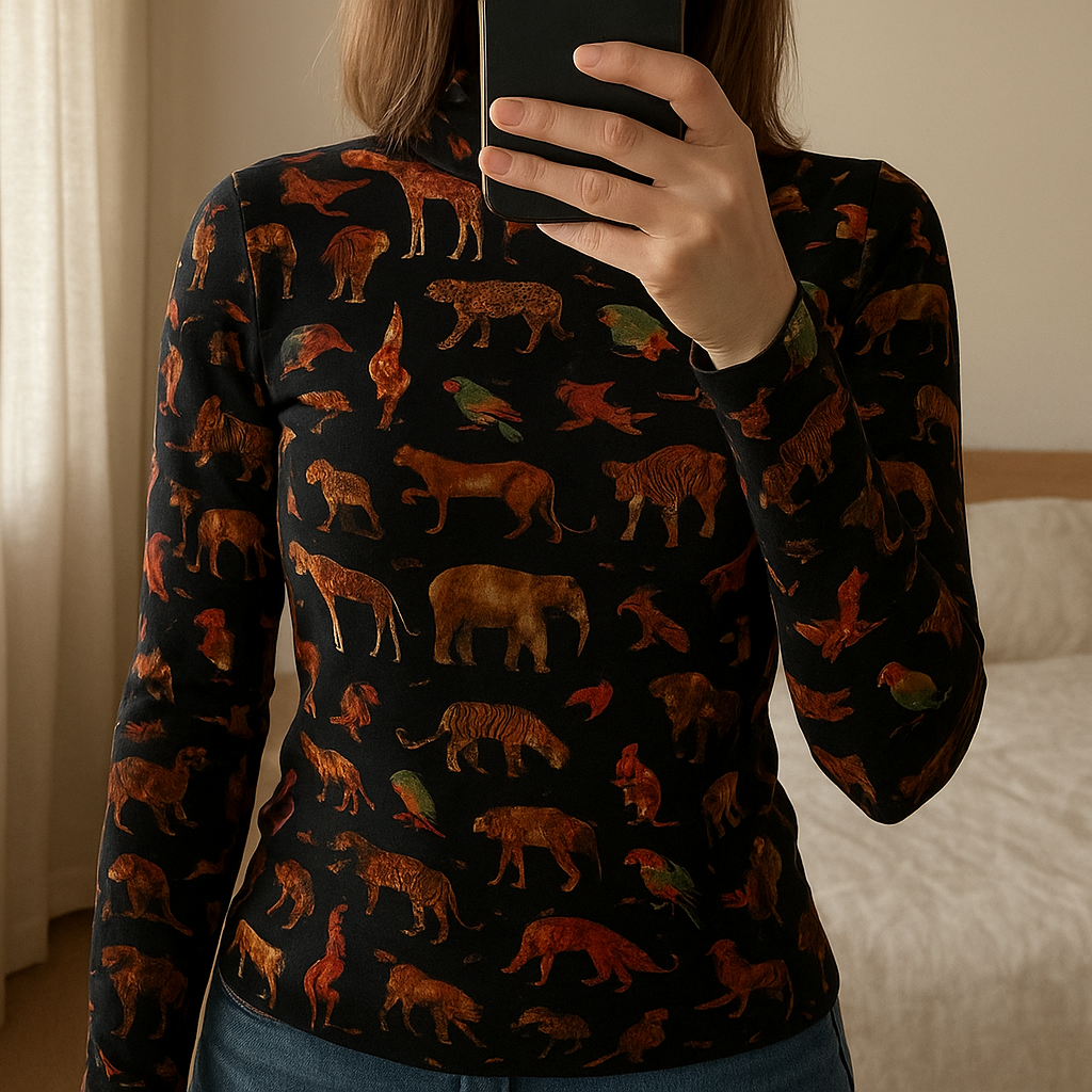 Pull femme Kenzo Jungle coton - Produit rare debout, face à la caméra, dans une chambre à la lumière douce, avec une lumière naturelle filtrant par la fenêtre.